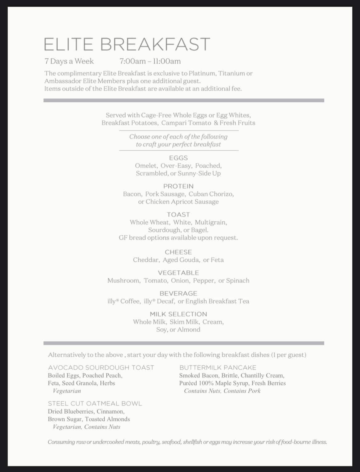 My breakfast sitting (or should I say brunch) was tasty enough, but I’d love to see the meal service in the restaurant be restored for the elite breakfast benefit, instead of just being limited to in-room orders.