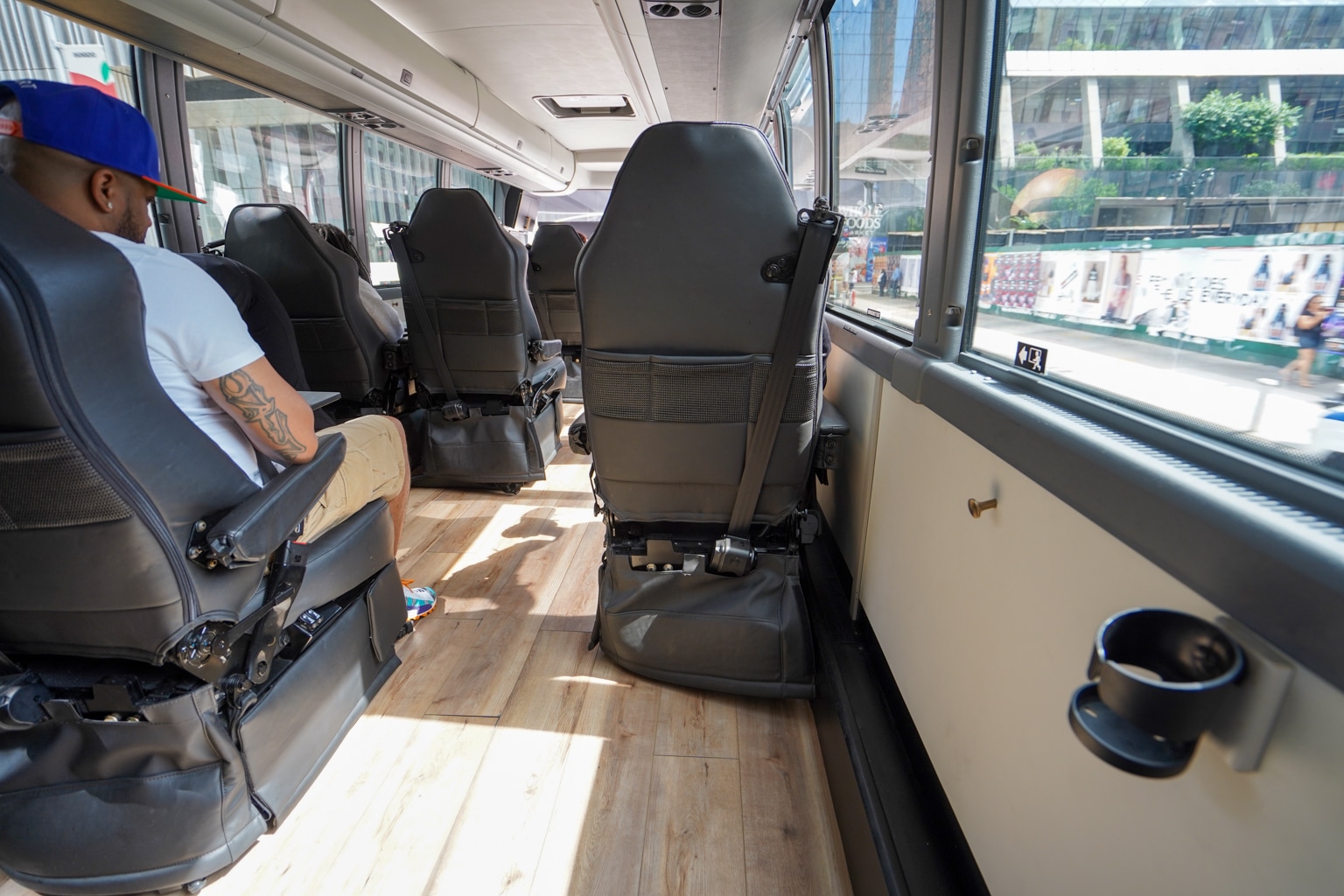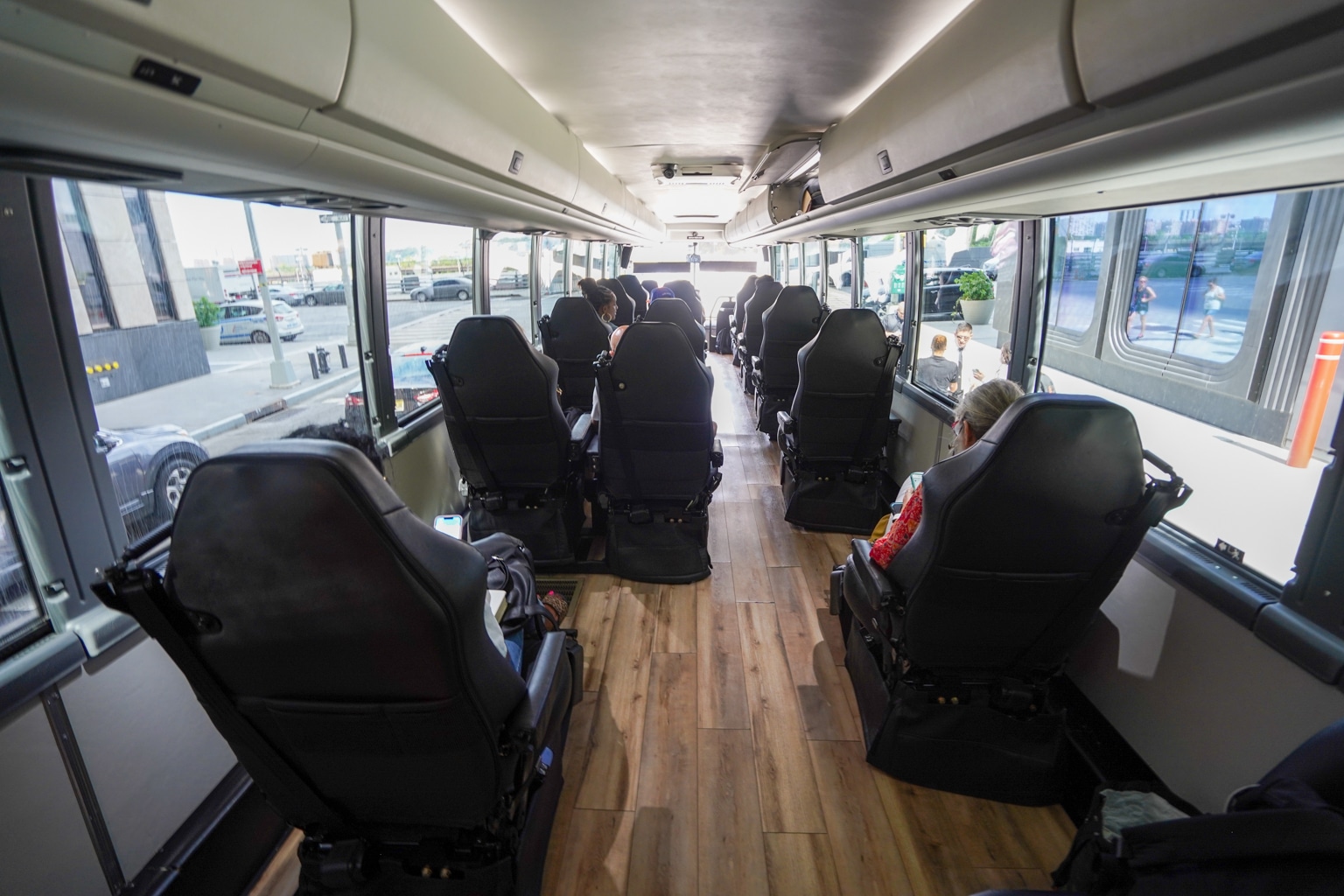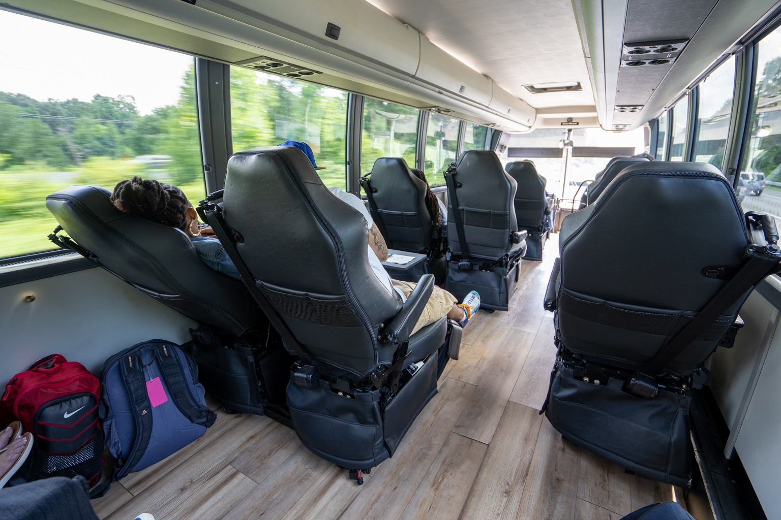When it comes to storage, there’s enough overhead bin room for personal items, such as backpacks. Here, you’ll also find railings to hold onto and stabilize yourself when leaving your seat and walking in the cabin while the bus is in motion.