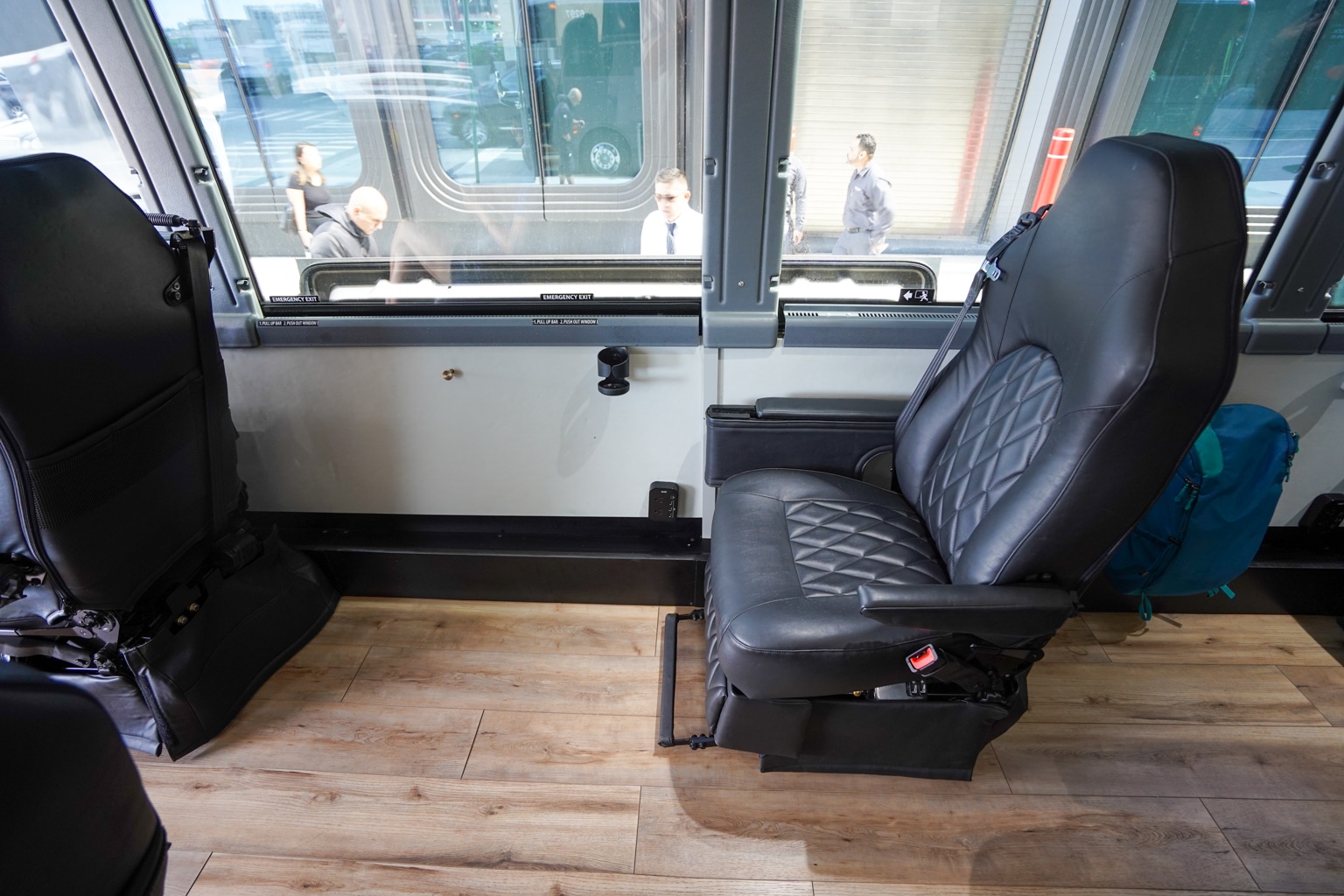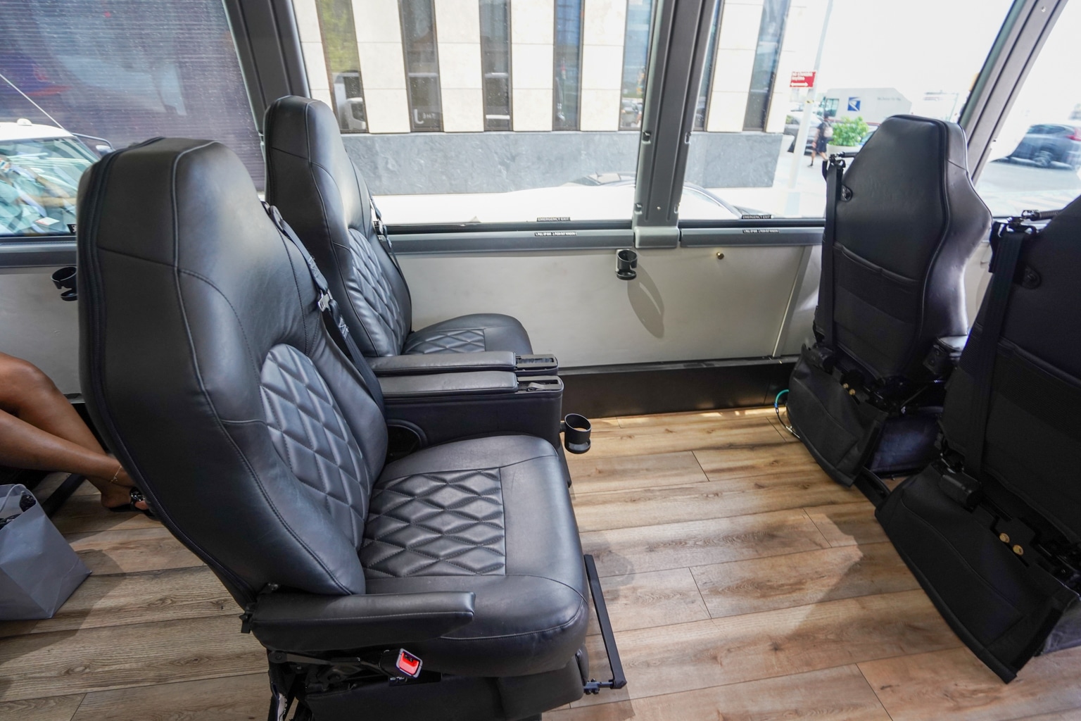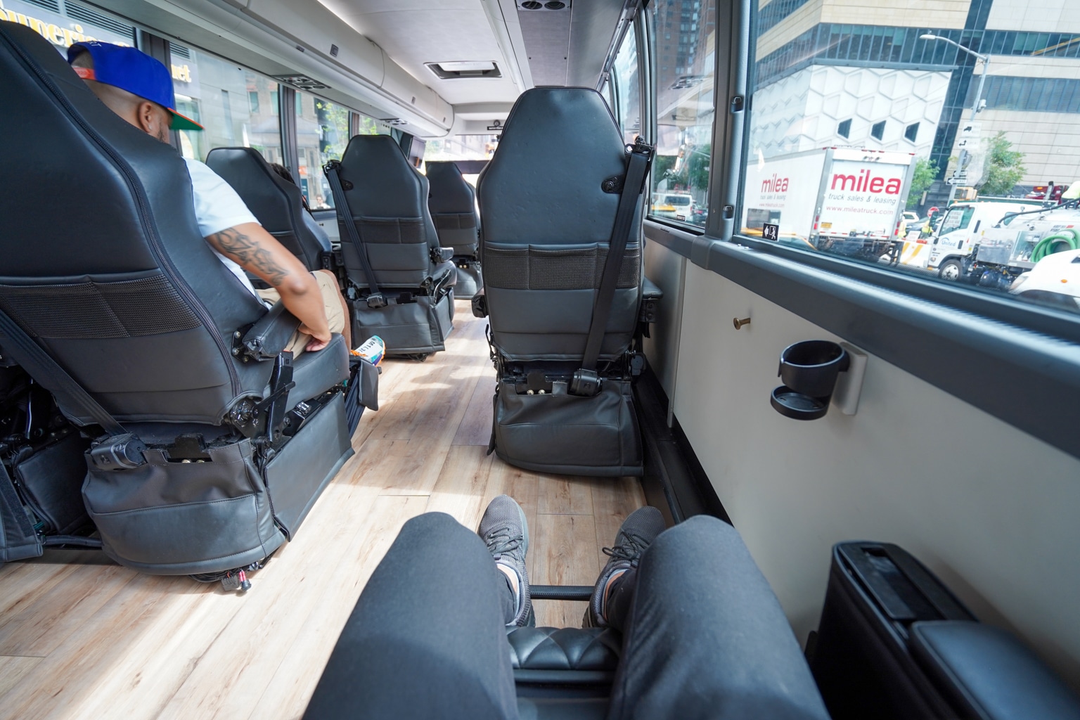 When it comes to storage, there’s enough overhead bin room for personal items, such as backpacks. Here, you’ll also find railings to hold onto and stabilize yourself when leaving your seat and walking in the cabin while the bus is in motion.