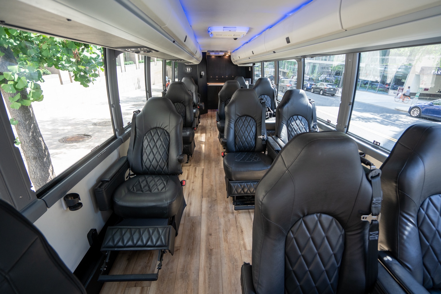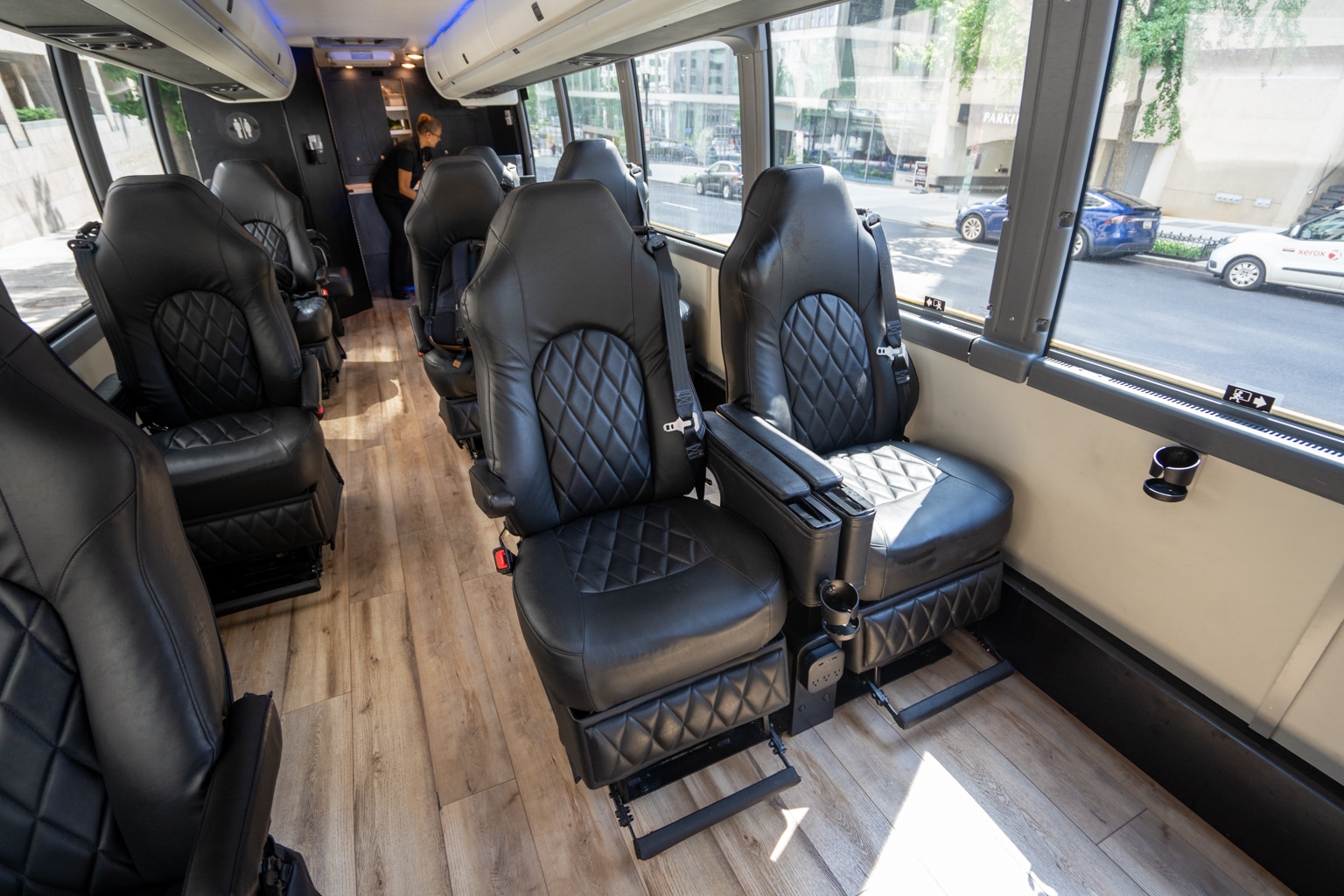 This new interpretation of a luxury motorcoach has 14 seats, and includes premium services such as Wi-Fi, snacks, drinks, and a restroom onboard.