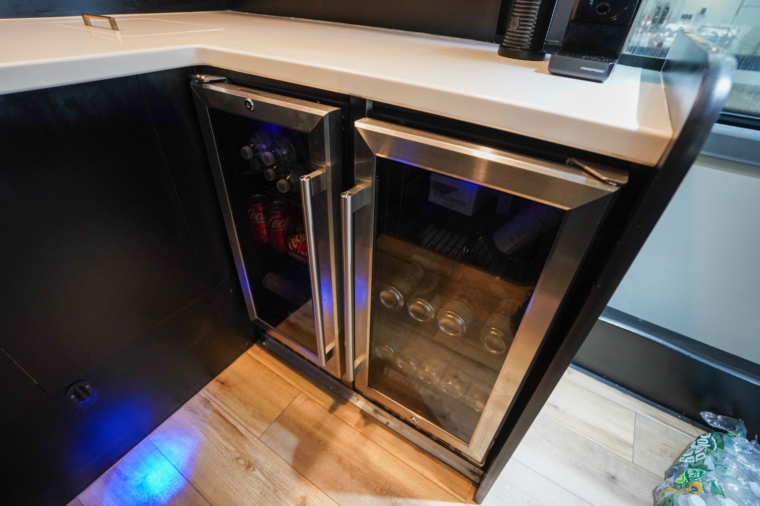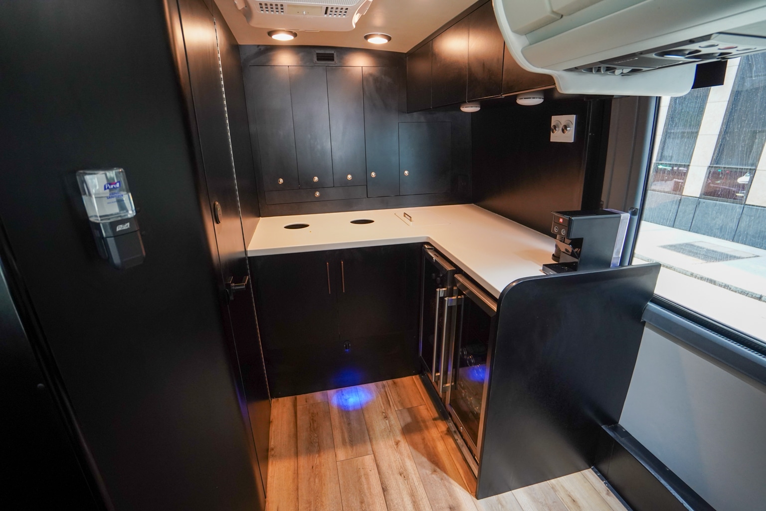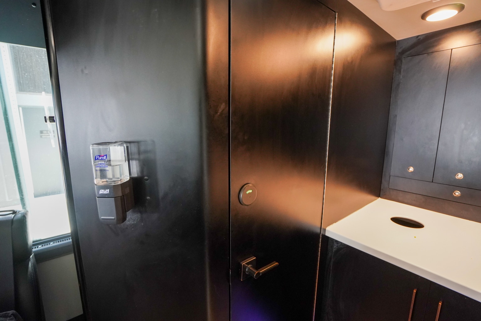 In keeping with the rest of the bus, the galley and restroom are decked out in a stylish black.