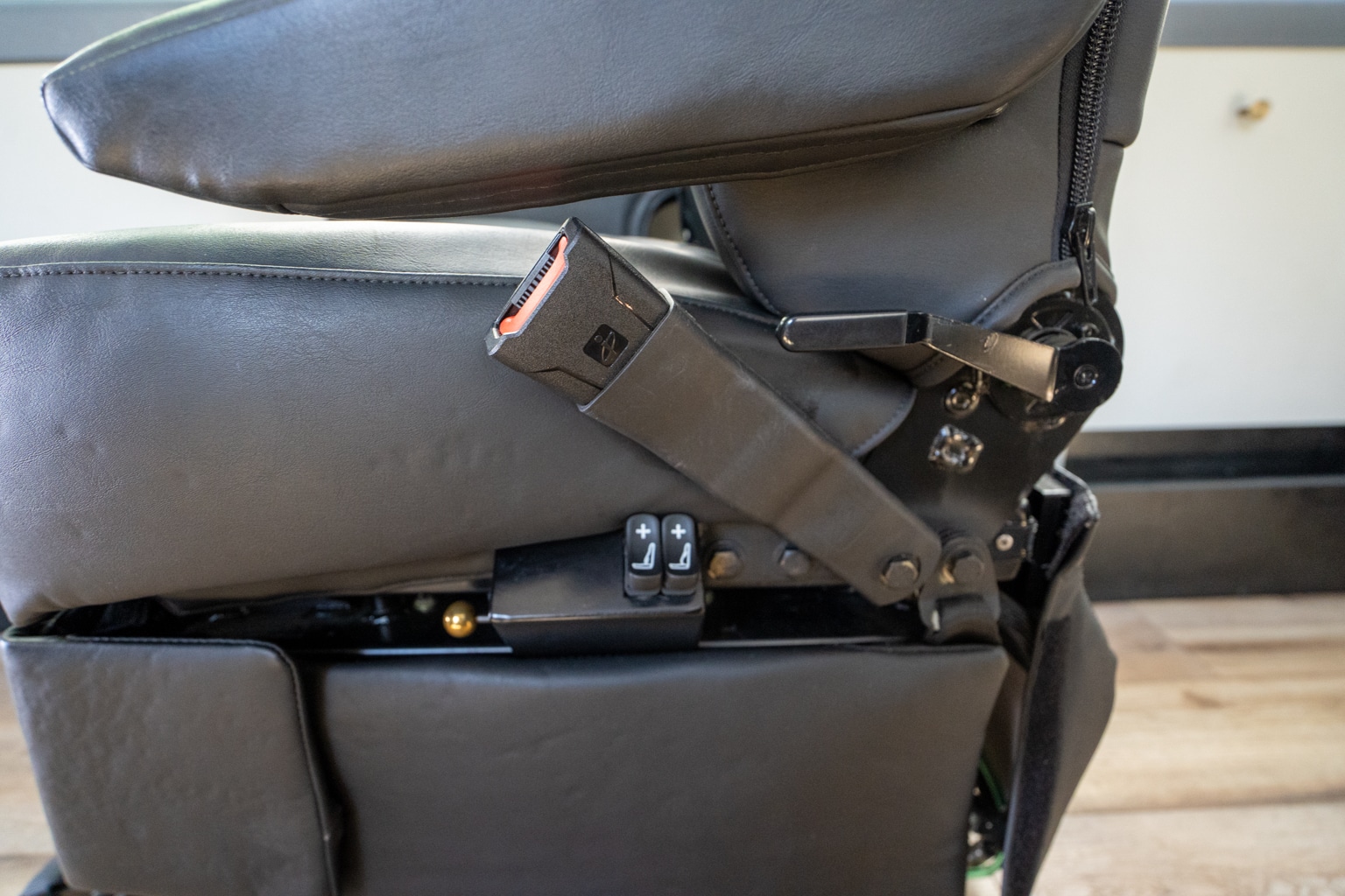 A set of seat controls reside on the left side of the seat near the seat belt. Here, you can adjust the back support, use a lever to recline the seat into a 45-degree recline, and pull a knob to pop the leg rest up.