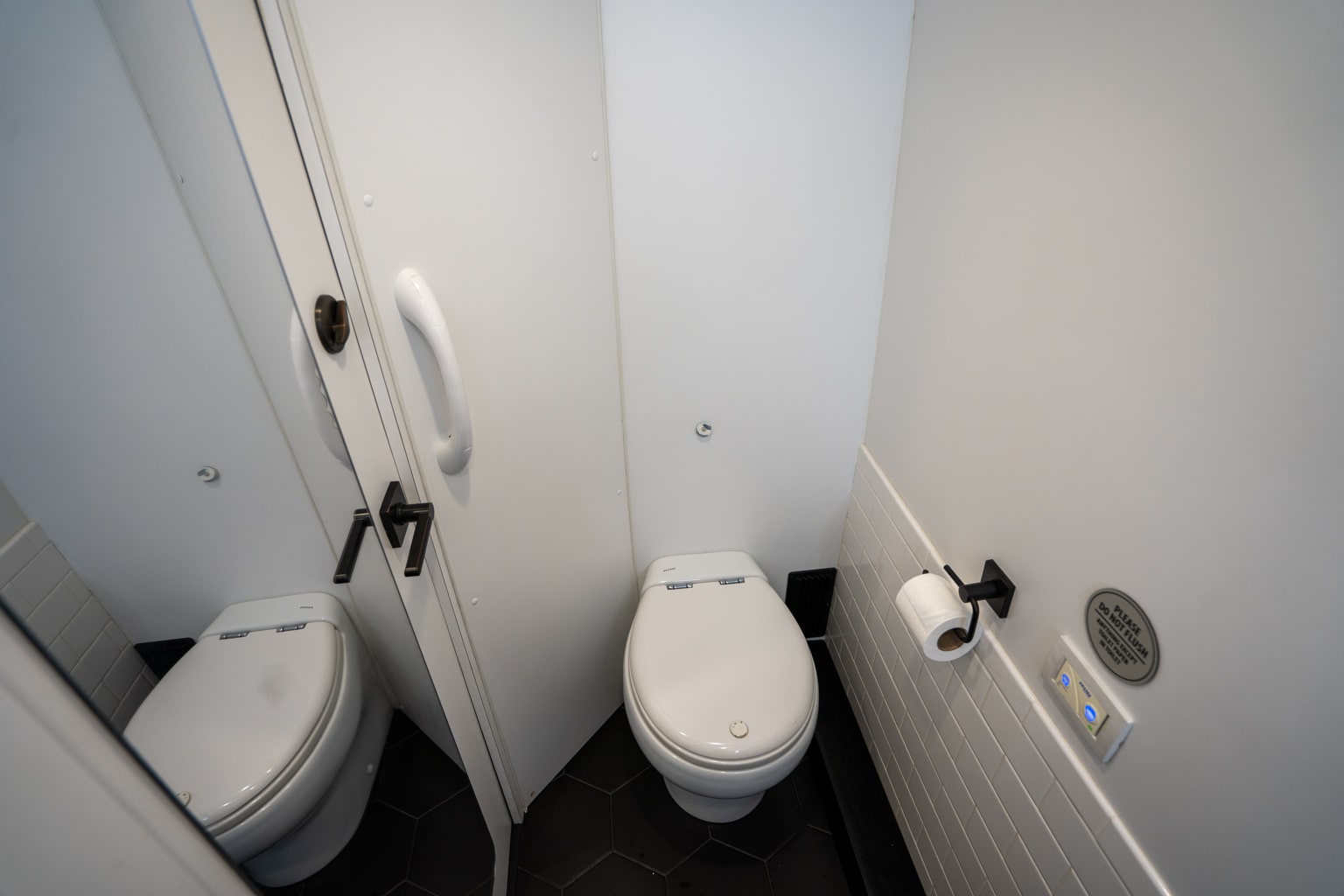 The restrooms here on The Jet are quite impressive for a motorcoac product, with a stylish, black-and-white palette, clean hex tiling on the floor, and even a patterned white brick accent wall.
