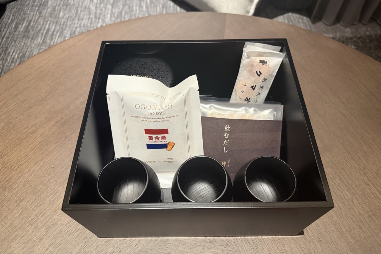 A box of pastries from the bakery located in the same building was thoughtfully arranged on the table as a welcome gift, along with a tea set with dashi tea, rice crackers, and candy that was replenished daily.