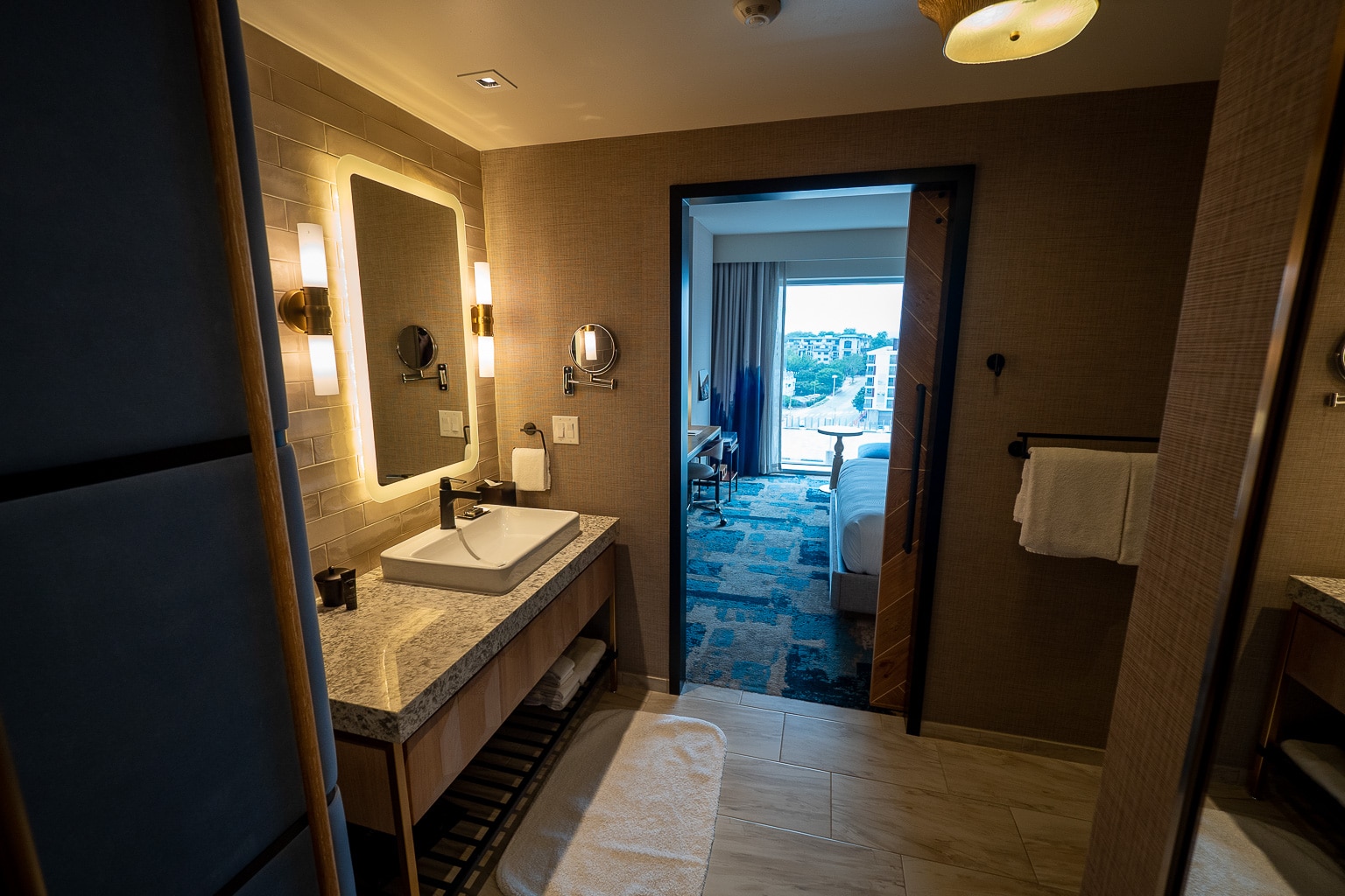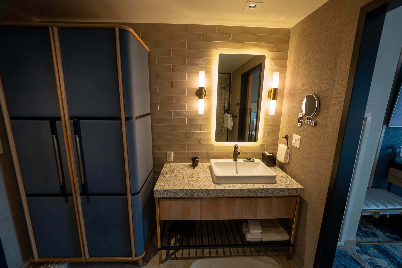 Located next to the closet is the room’s vanity, with a rectangular mirror in a backlit frame and lamps on either side.