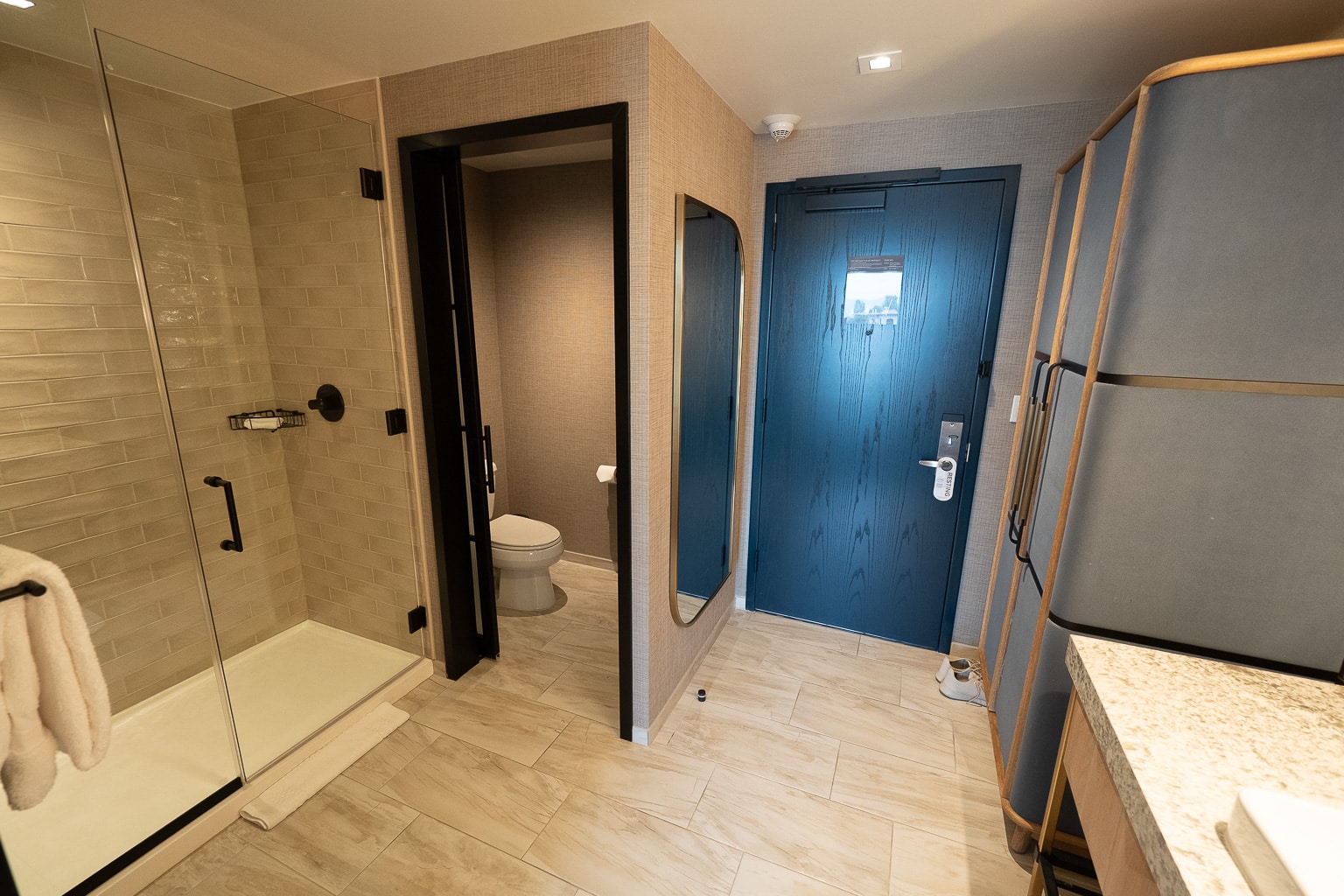 Still, the entry is appointed as an entry, with a velvet-exterior closet containing the hotel standards: an iron, a safe, and bathwear.
