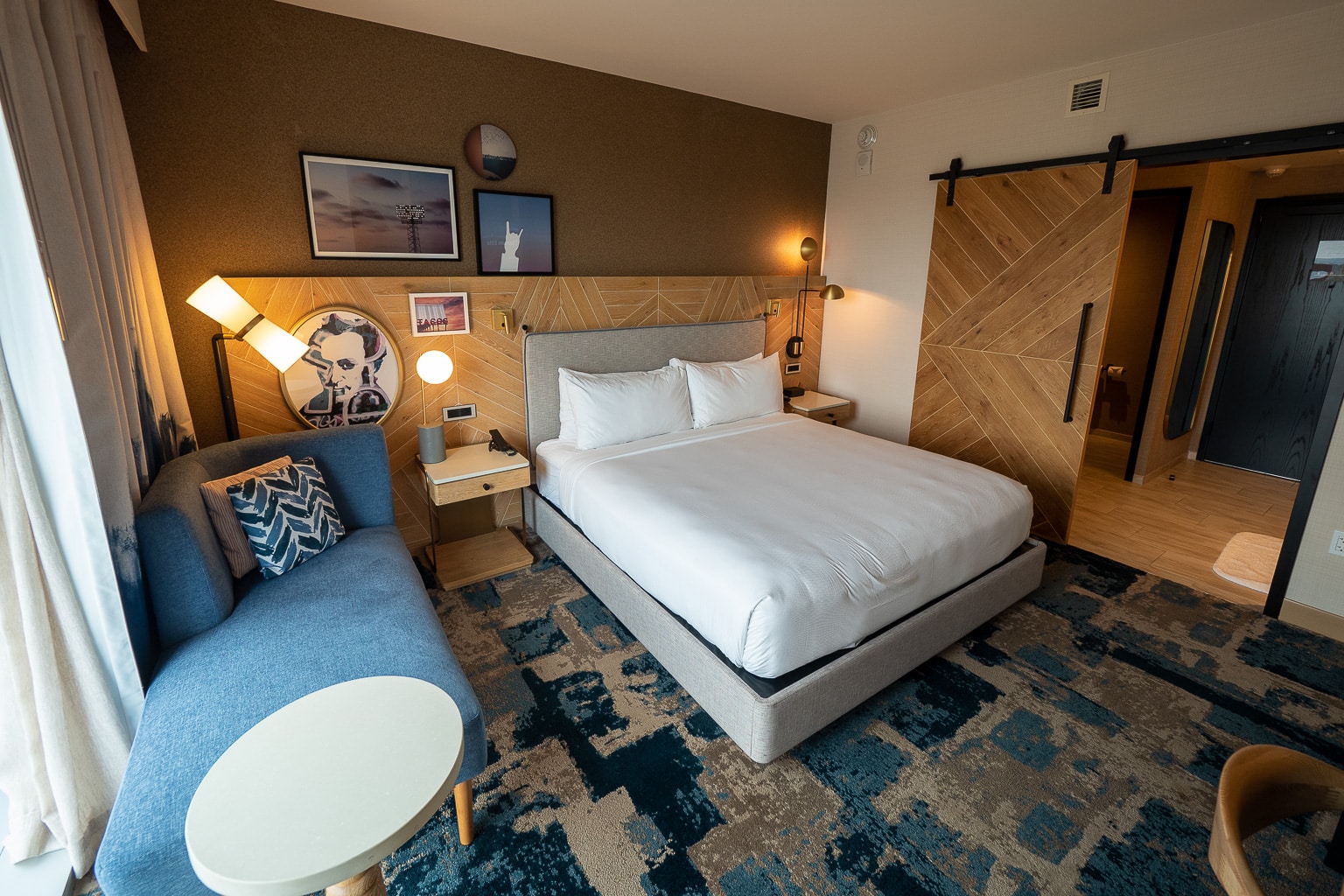The bedroom is separated from the bathroom by a sliding barn door. The bedroom has a much more noticeable style than the bathroom, with wooden panels pointing every which way on the headboard and sliding door.