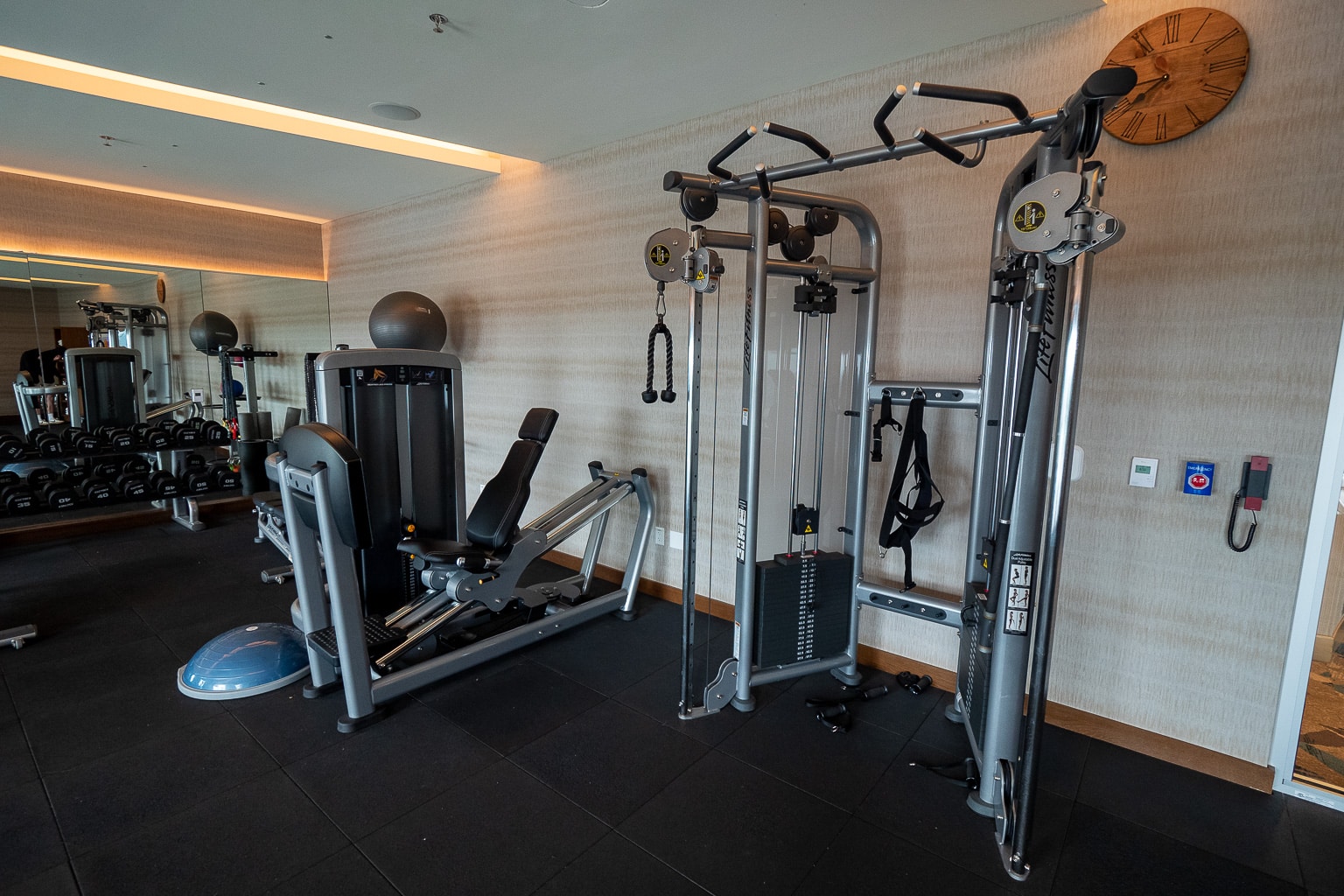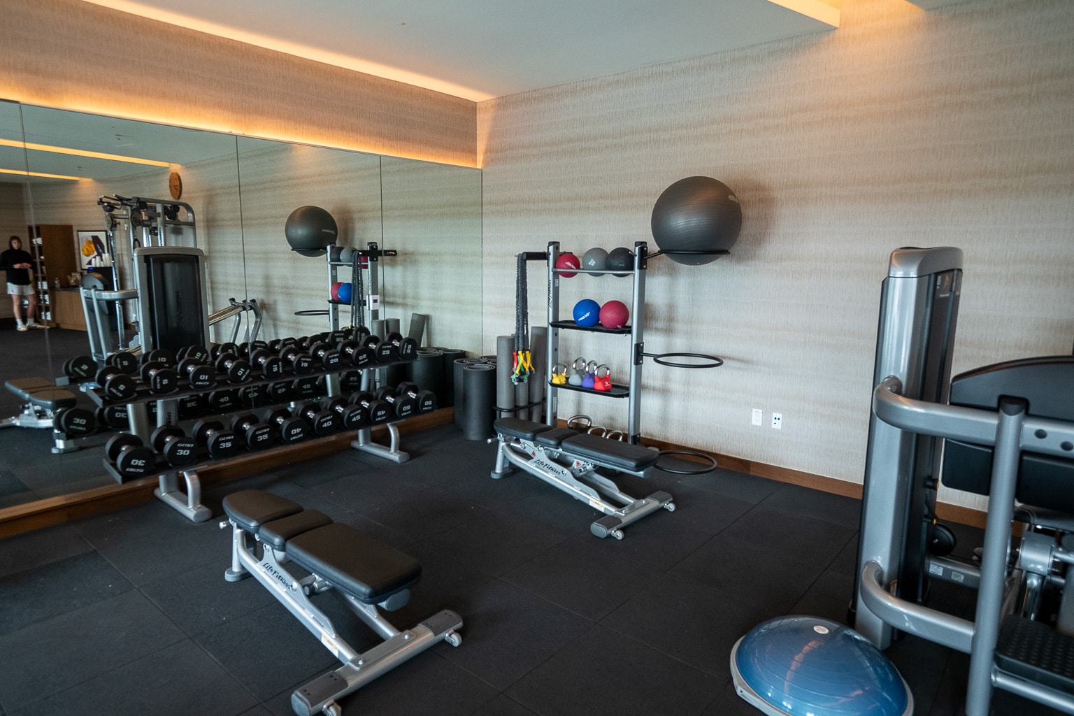 The 24-hour fitness centre is also on the top floor, well-outfitted for any type of strength, cardio, or mobility workout.