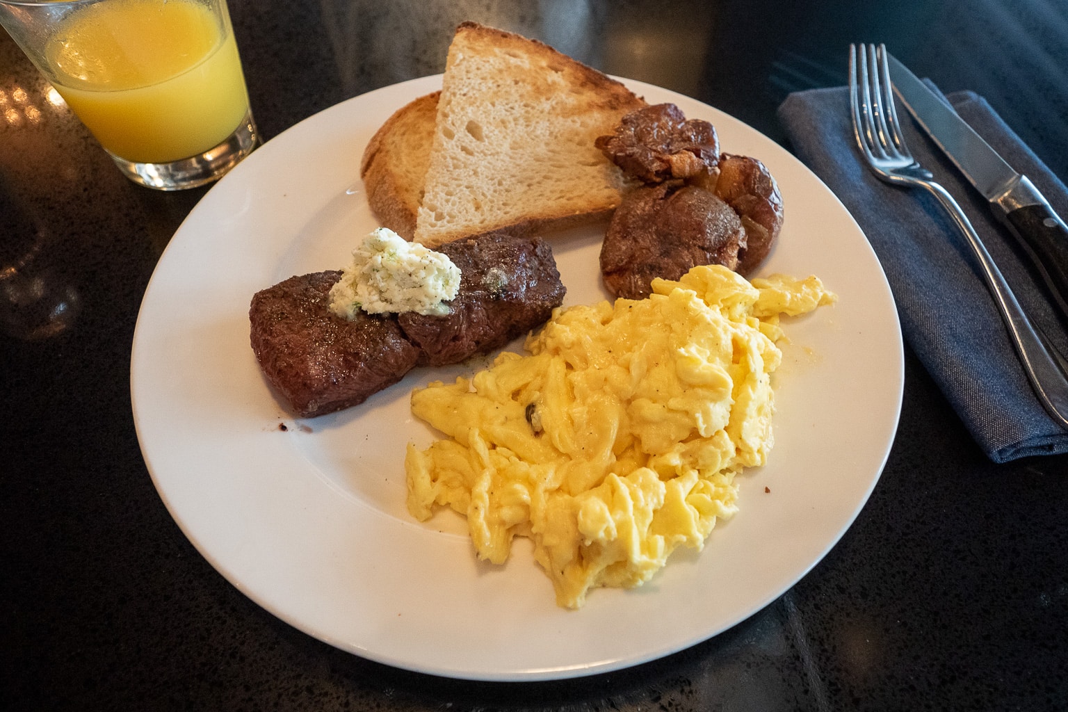 At my server’s recommendation, I chose the wagyu flat-iron steak, cooked medium-rare, with scrambled eggs.