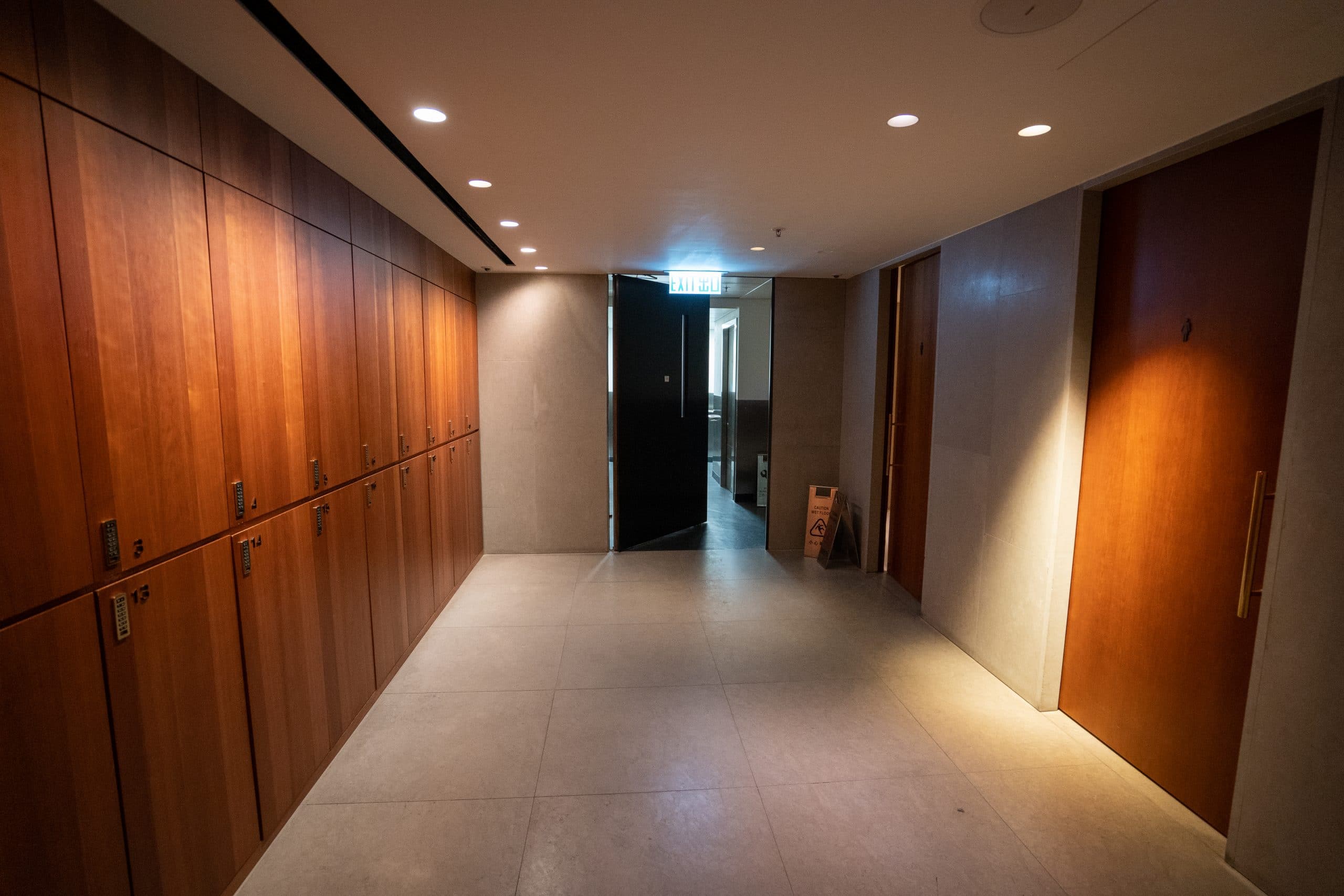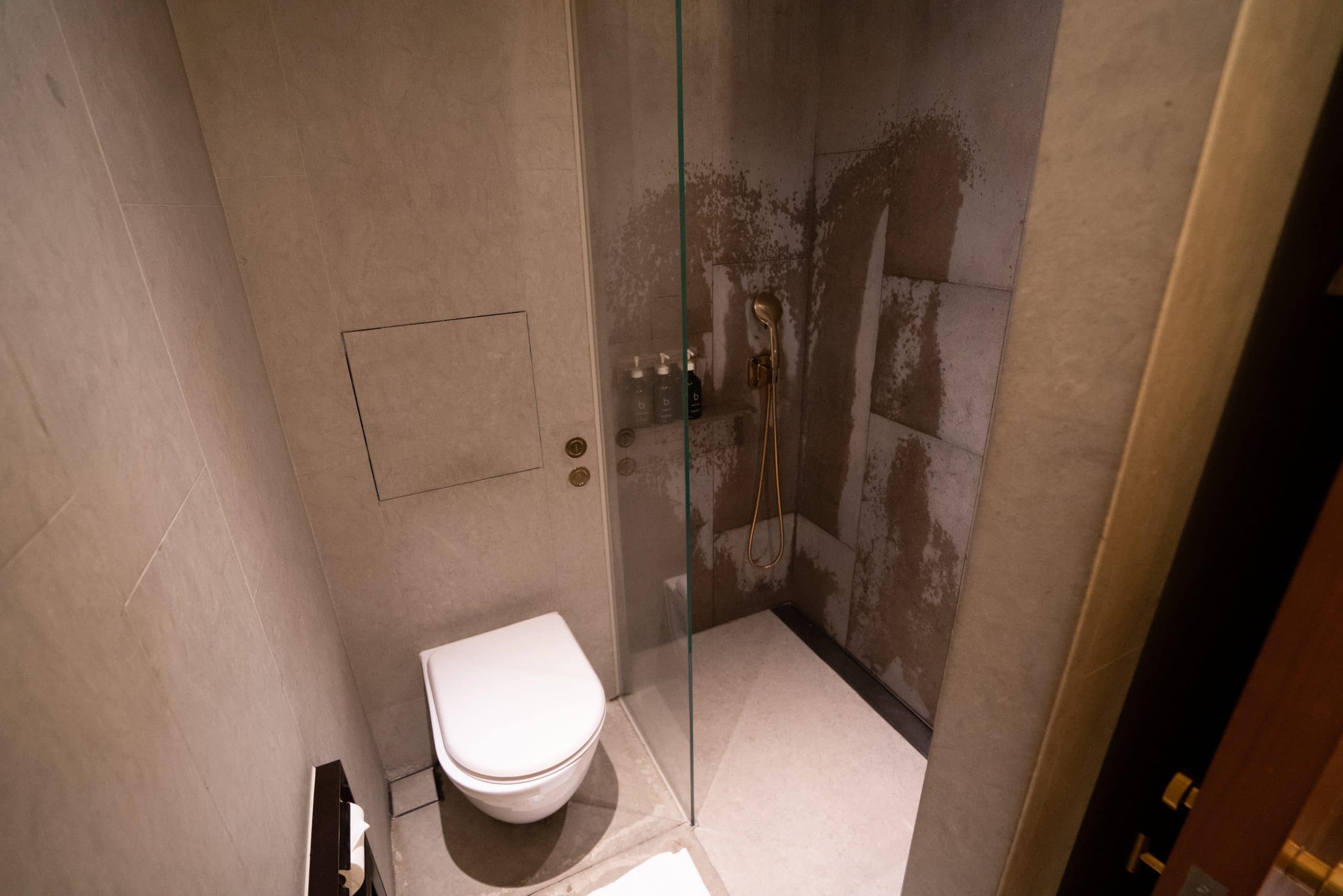 The hallways that lead to the shower suites and bathrooms have a distinctly modern appearance, with grey slatted walls. Stepping inside, the shower rooms are marble-clad with a walk-in rain shower, toilet, and a single vanity.