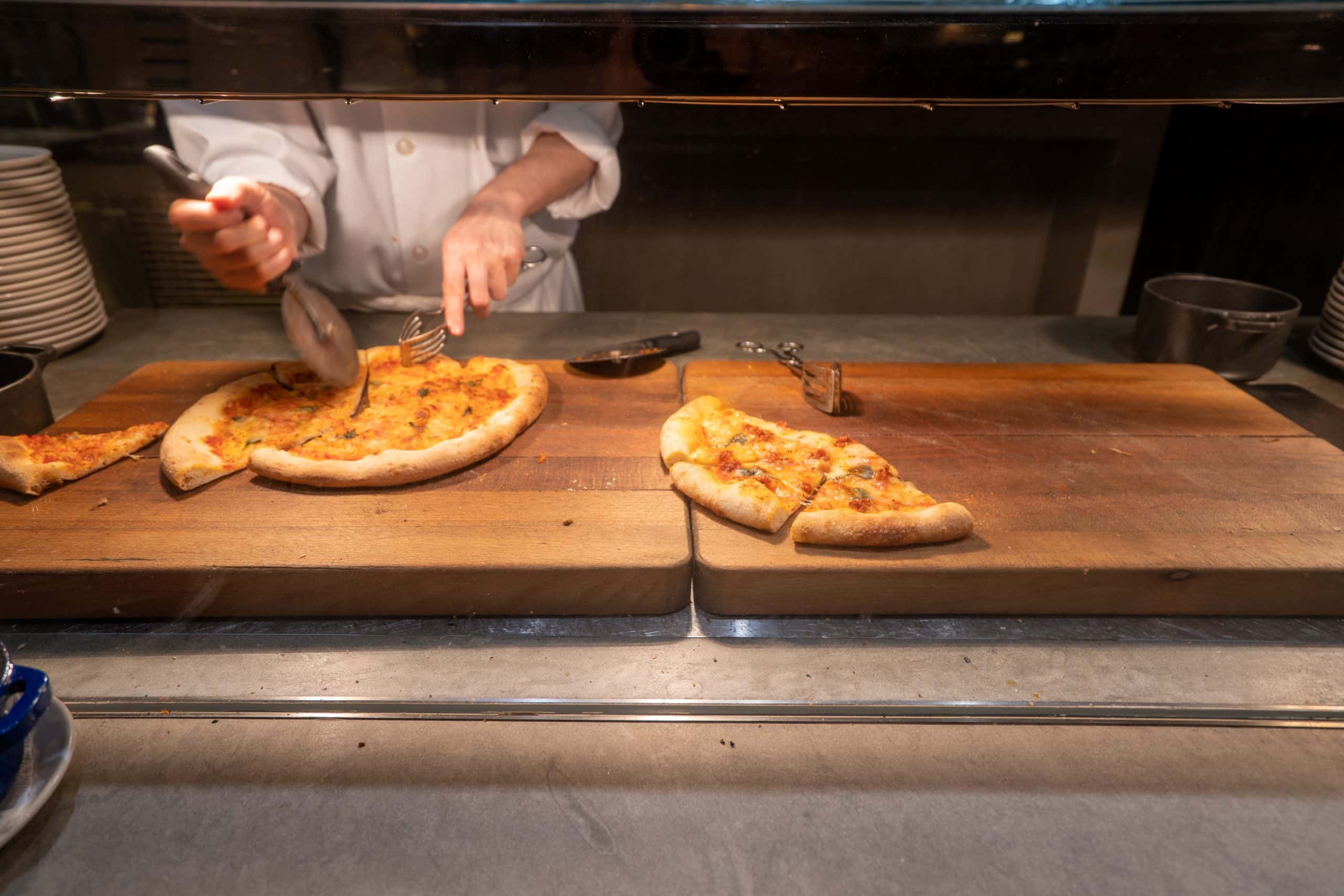 The selection leans towards Western dishes such as pizza, cold cuts, cheese, and salad. Along with self-serve fresh juices, sparkling, red, and white wine, you can also find a fully stocked refrigerator offering an ample choice of soft drinks and beer.