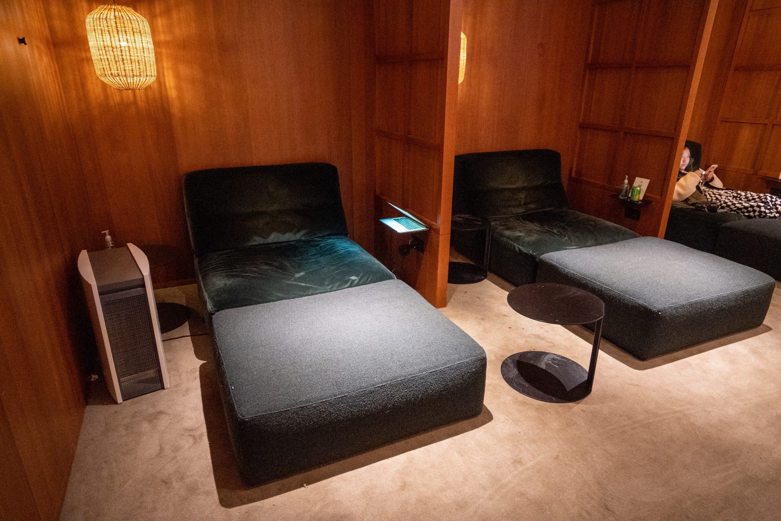 Outside of this relaxation zone, you’ll find two generously sized plush sectionals that face each other, serving as a comfortable waiting area if the day beds happen to be occupied.