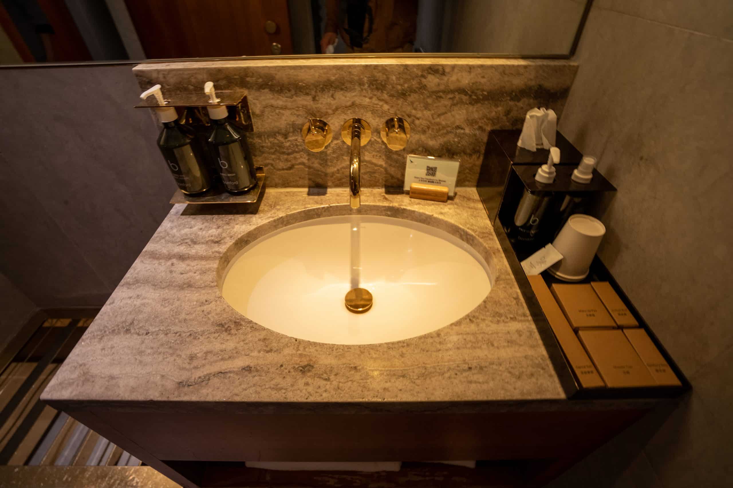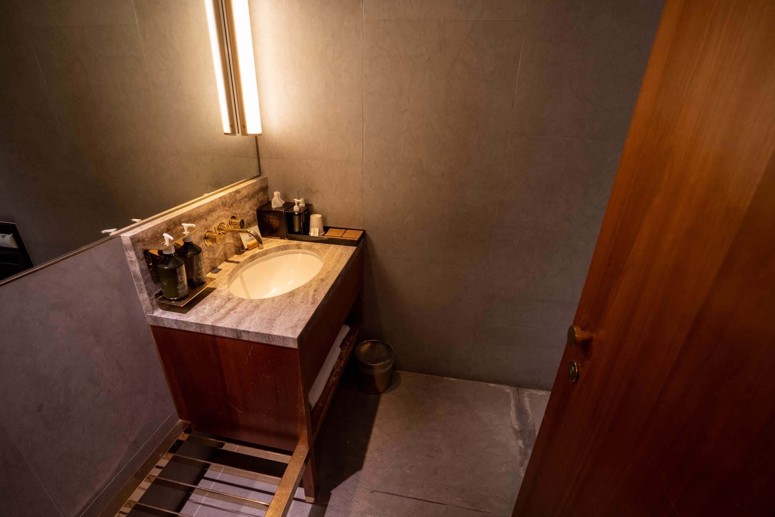 Similarly, the lounge’s washrooms have a clean and modern aesthetic, complete with stylish brass fixtures, elegant marble counters, and Aesop bath amenities.