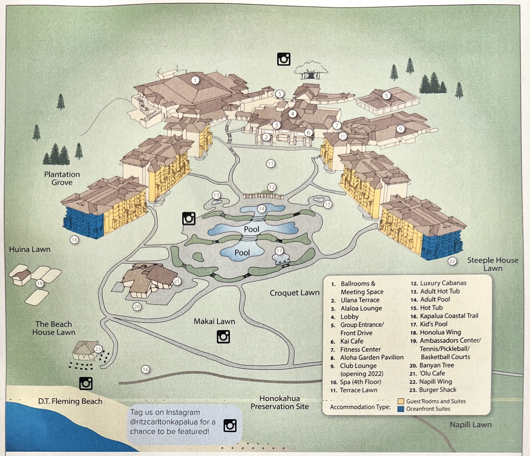 There are also a gym and full-service spa onsite. Use of tennis and basketball courts is complimentary and can be found on the way to the beach. Lawn games like shuffleboard and bocce are located by the pools.