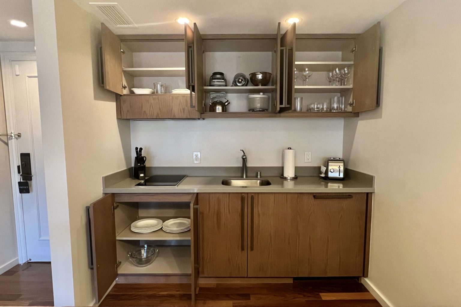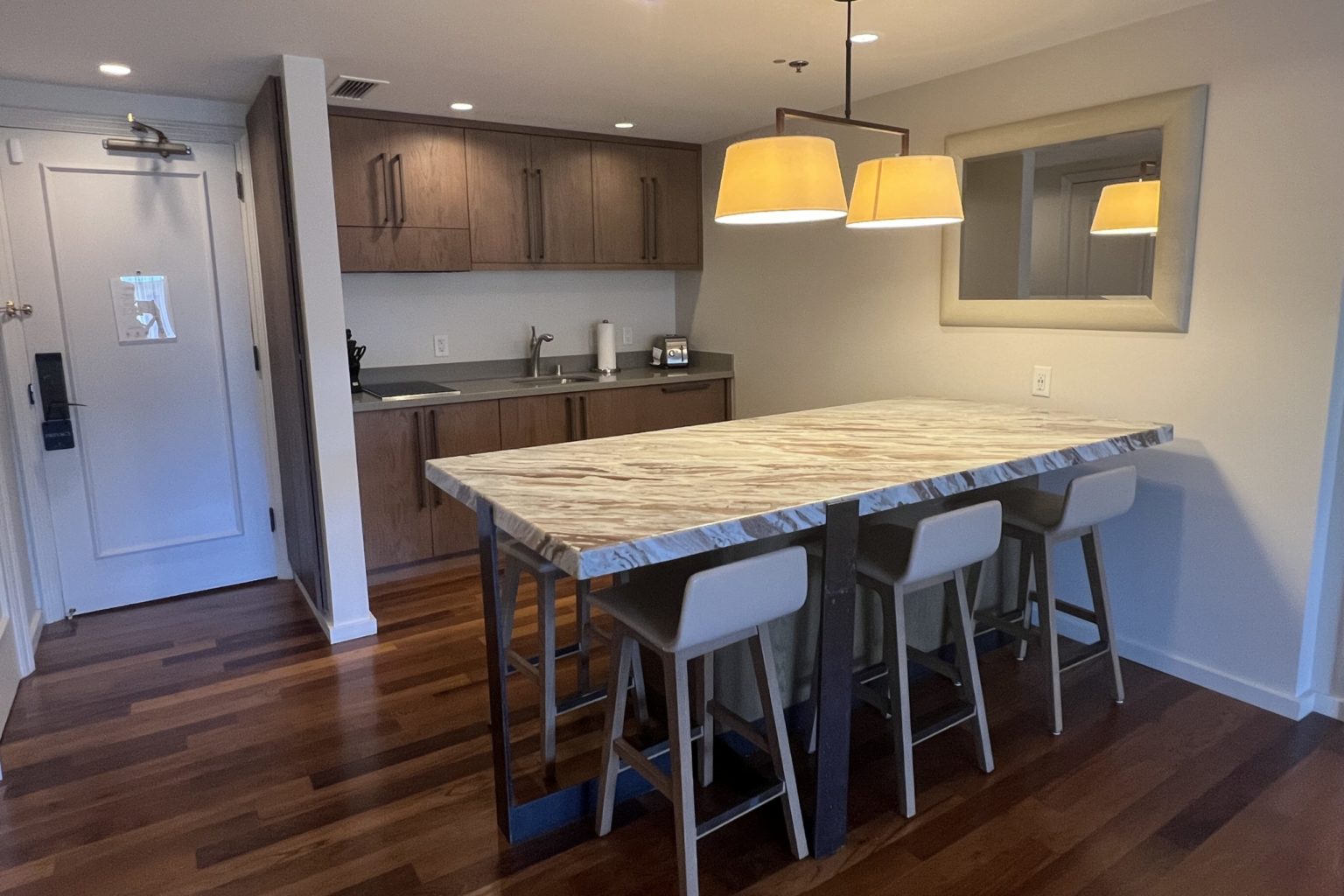 As you enter, it immediately opens up into the kitchenette, with a marble-top bar table with a few bar stools.