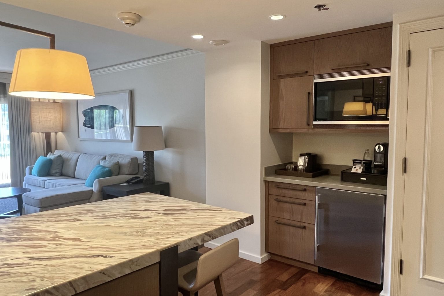 On the other side of the suite is a minibar with a Nespresso machine, small fridge, and microwave.