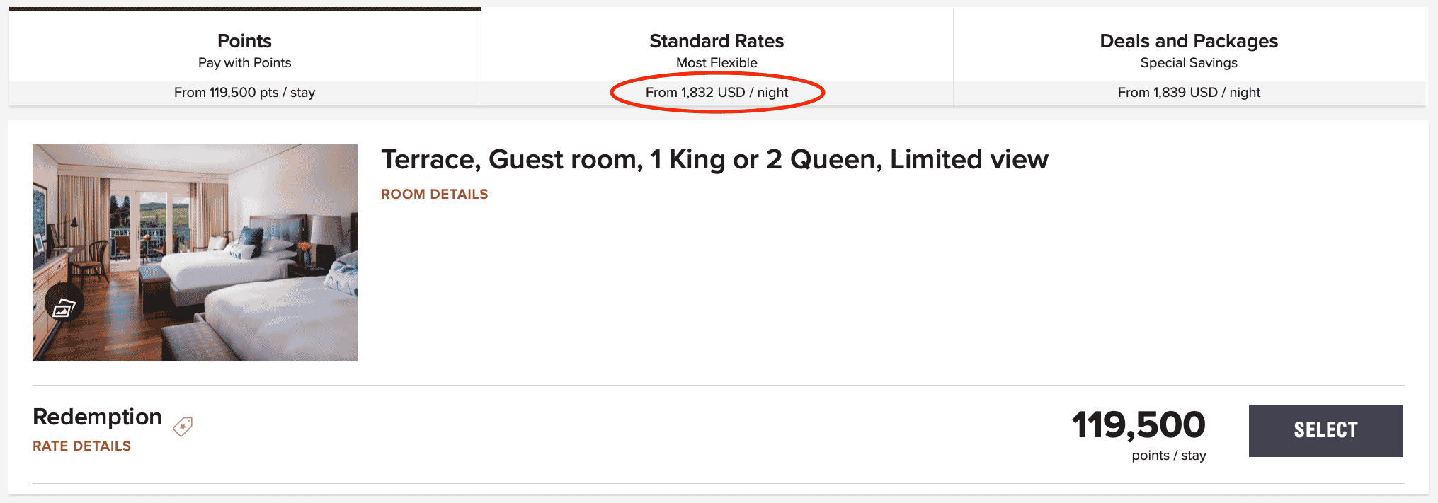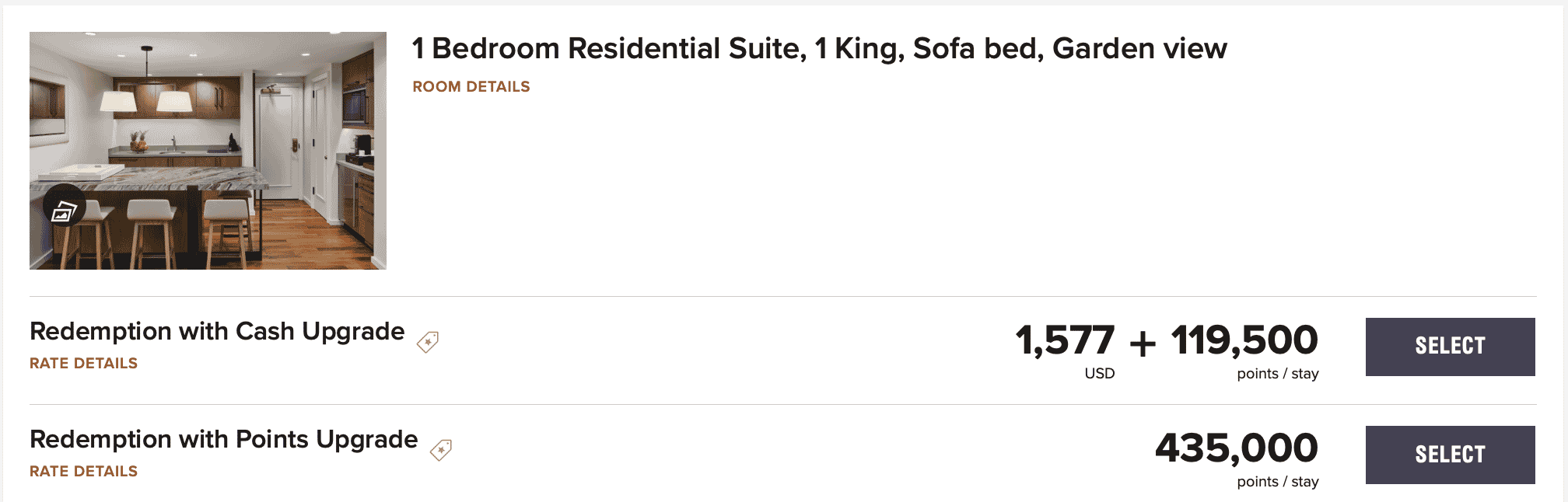 At that time, no rooms were available for redeeming points. Rather, there were only “Redemption with Cash Upgrade” options. One option that caught my eye was the One-Bedroom Residential Suite, one of their top accommodation categories, for US$450 plus 70,000 points per night.