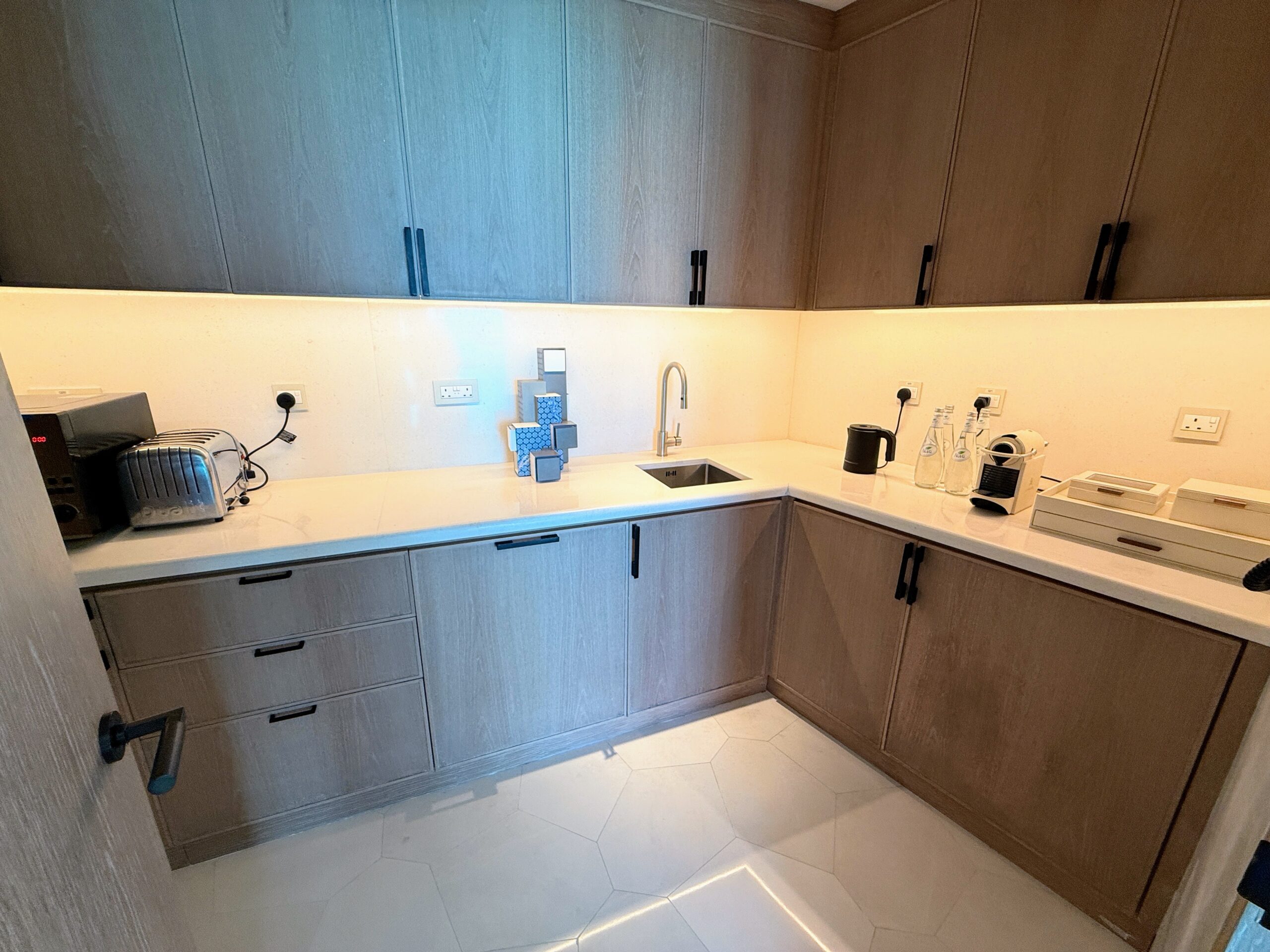 Conveniences like a powder room and a discreet corner kitchenette added comfort without disrupting the villa’s airy feel. The kitchenette includes a microwave, beverage fridge, sink, toaster, and tea and coffee station.