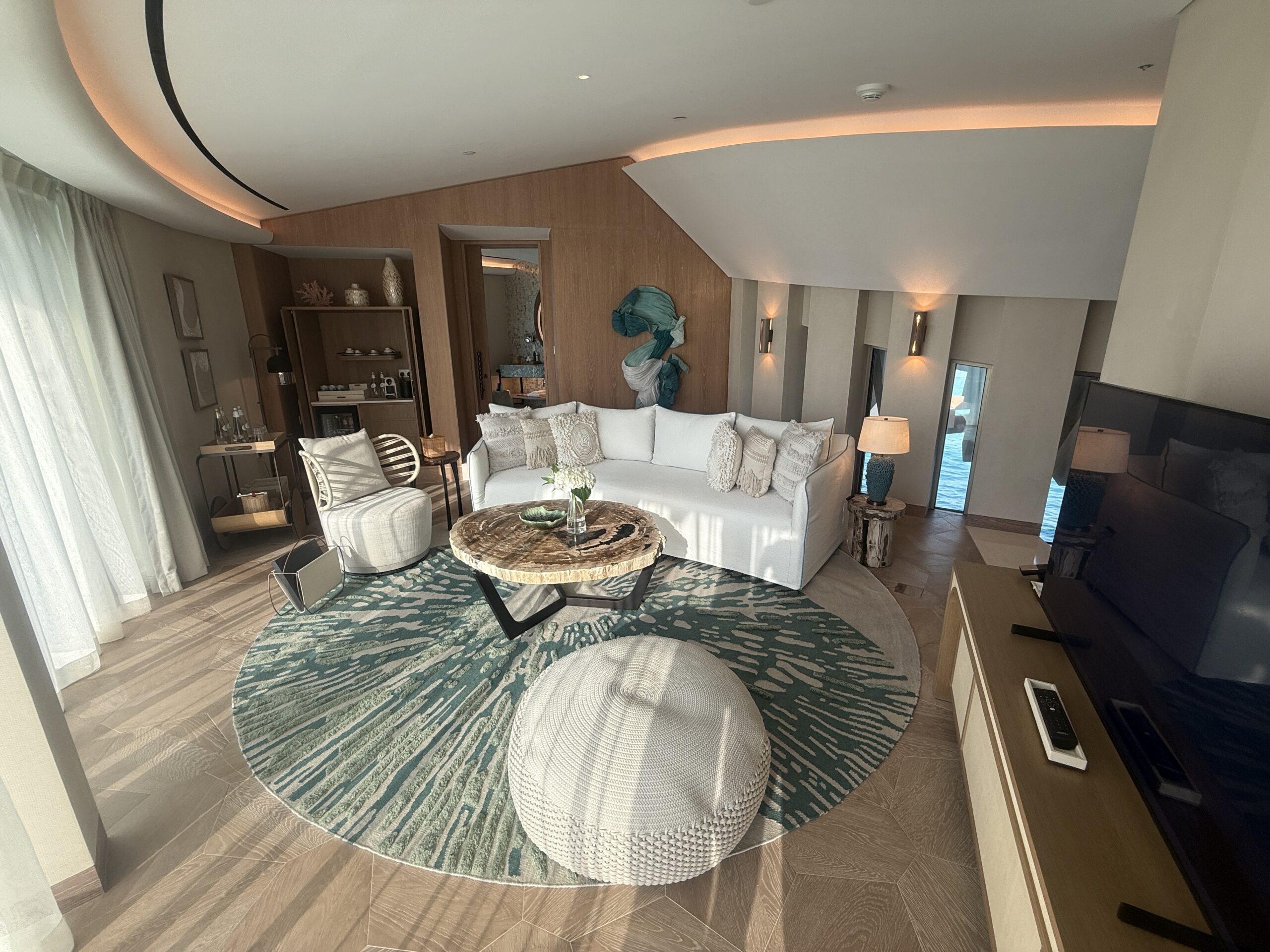 The Two Bedroom Coral Villa combines bright coastal design with expansive indoor and outdoor space. Inside, the living room features floor to ceiling windows and soft, neutral décor. A curved sofa and textured seating creates an inviting space for relaxing with snacks or watching a movie.