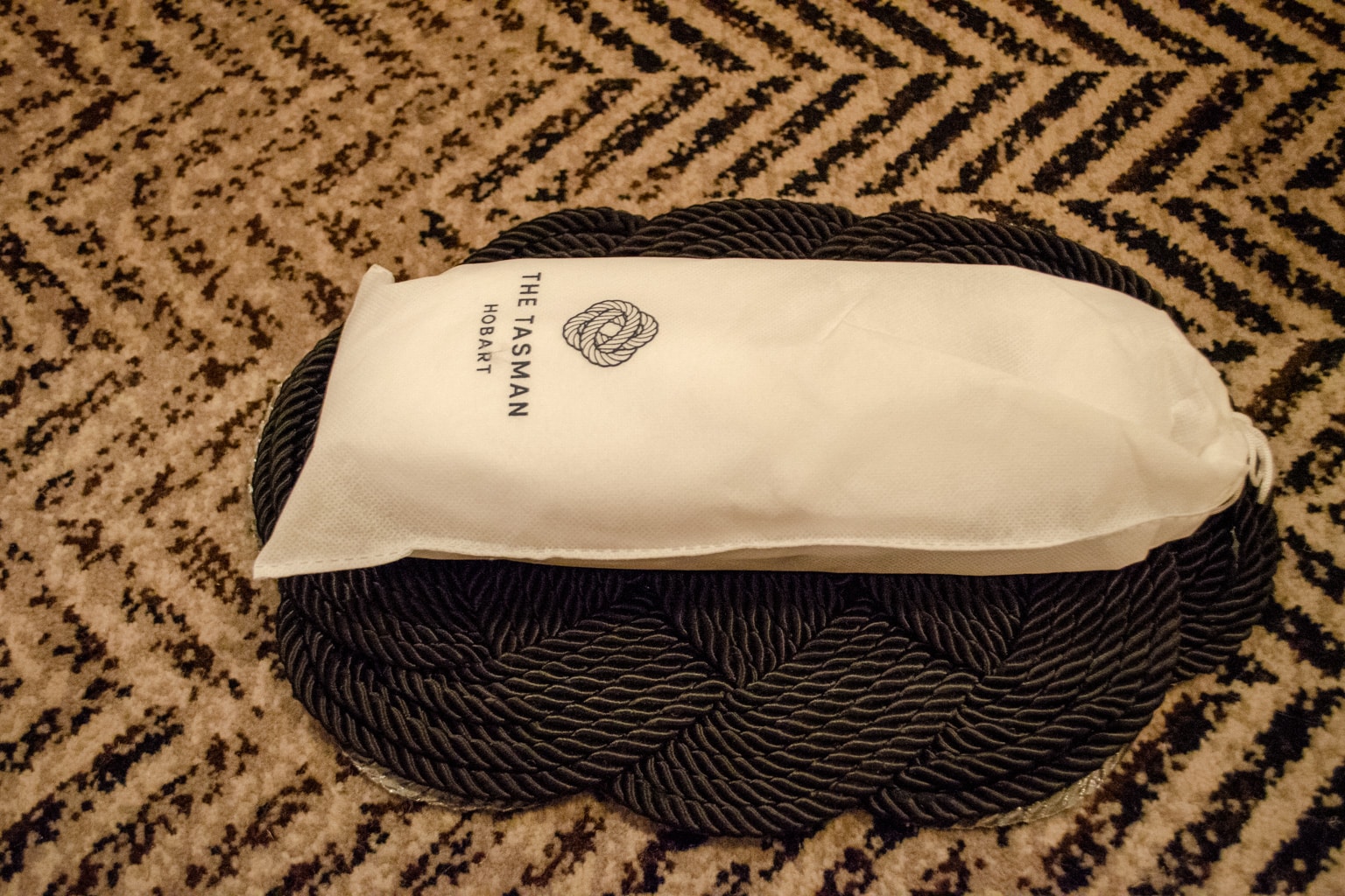 During turndown service, slippers were placed next to the bed on a mat that matched The Tasman Hobart’s logo.