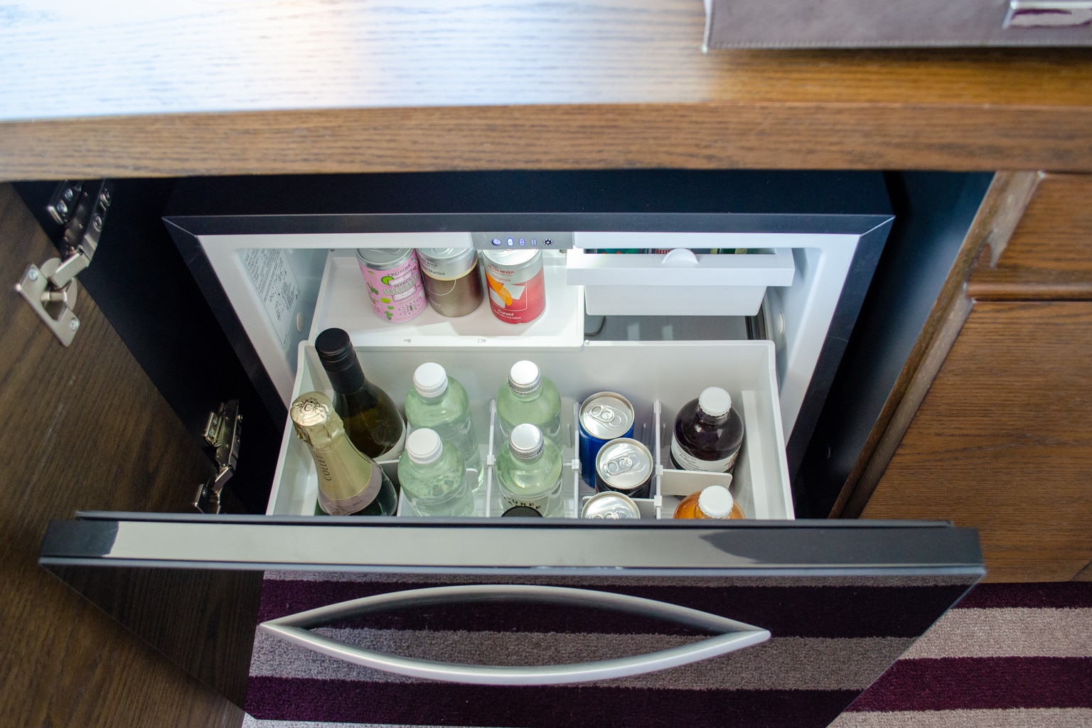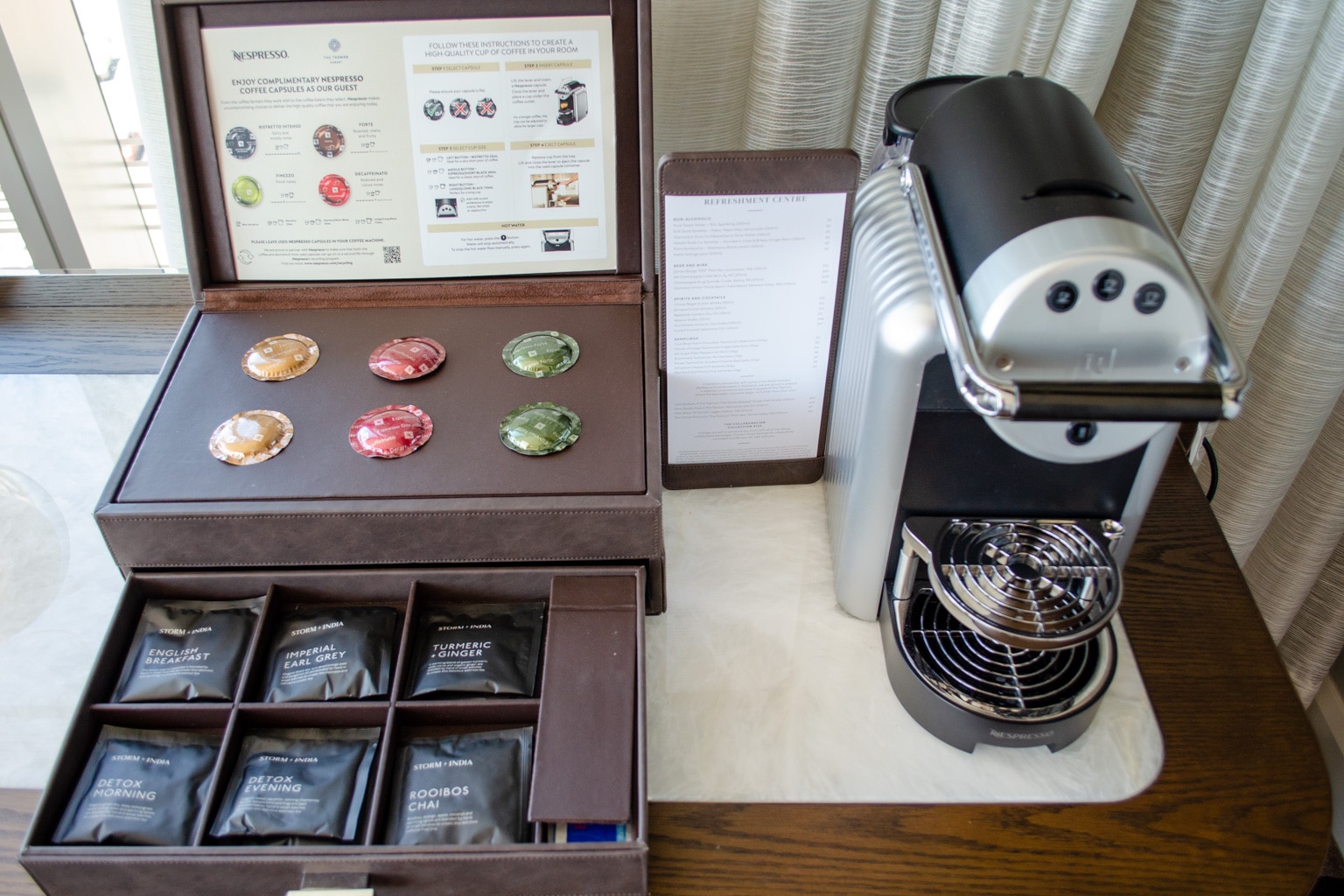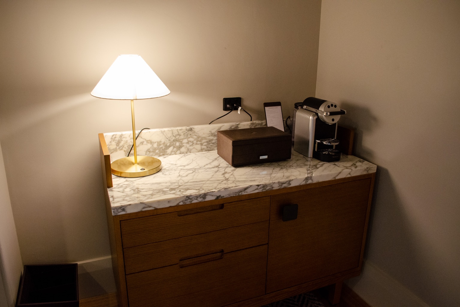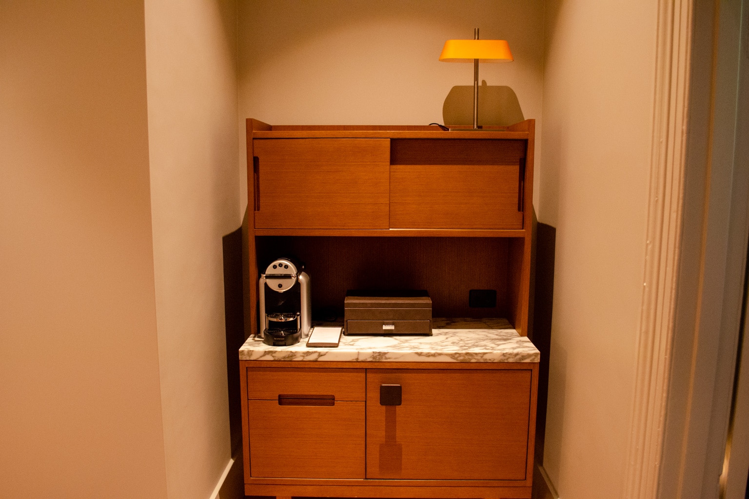 Through the room’s foyer, there’s a buffet in an alcove between the bathroom and the bedroom. The buffet is home to the room’s Nespresso coffee maker and minibar, and features a thick marble surface.