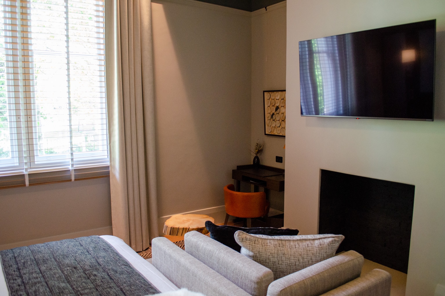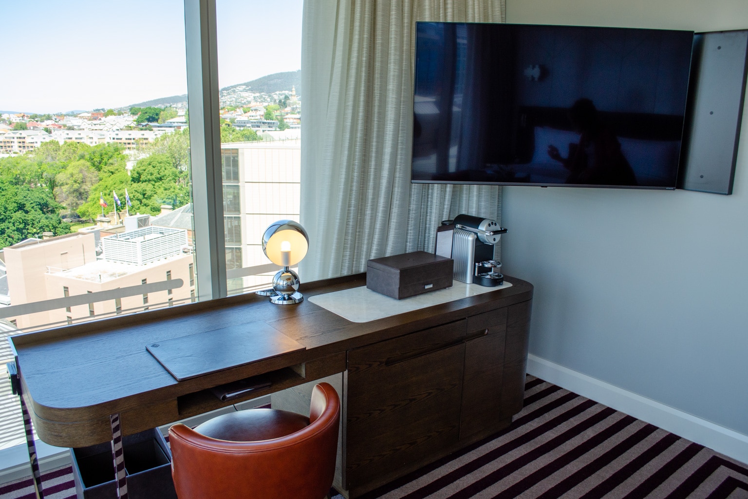 Up against the window, there’s a beautiful wooden desk with a comfortable leather chair. The room’s flat-screen TV is mounted on the wall nearby, and can be swivelled into a comfortable viewing position.