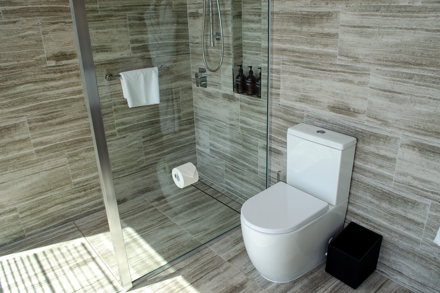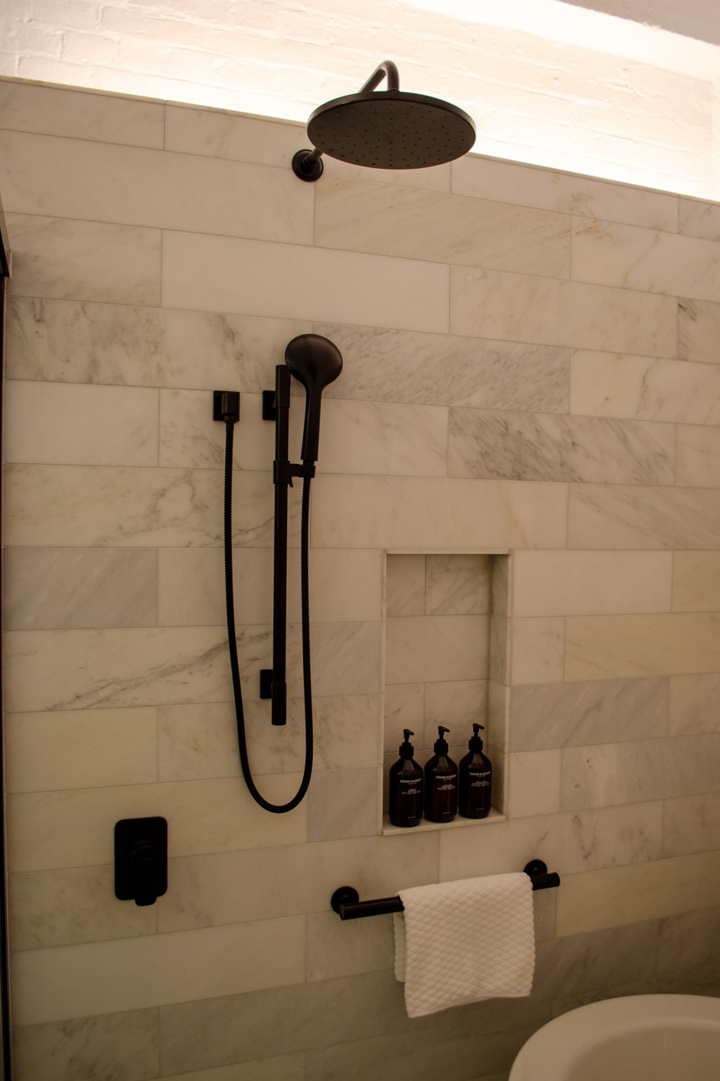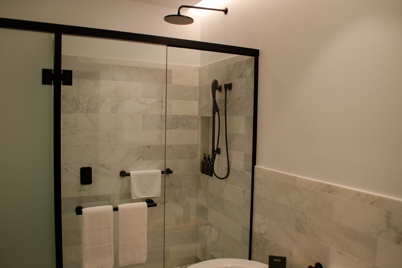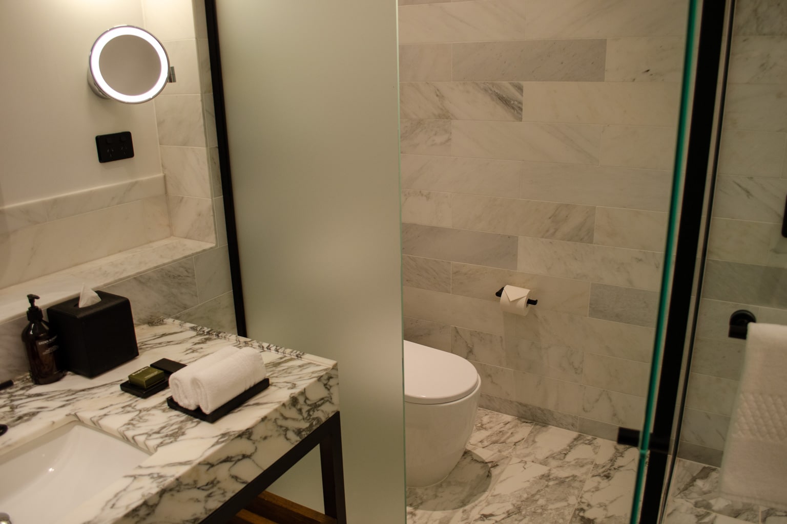 The room’s toilet is located in a frosted-glass room next to the shower. Otherwise, the bathroom was very similar to the one in the Heritage Suite.