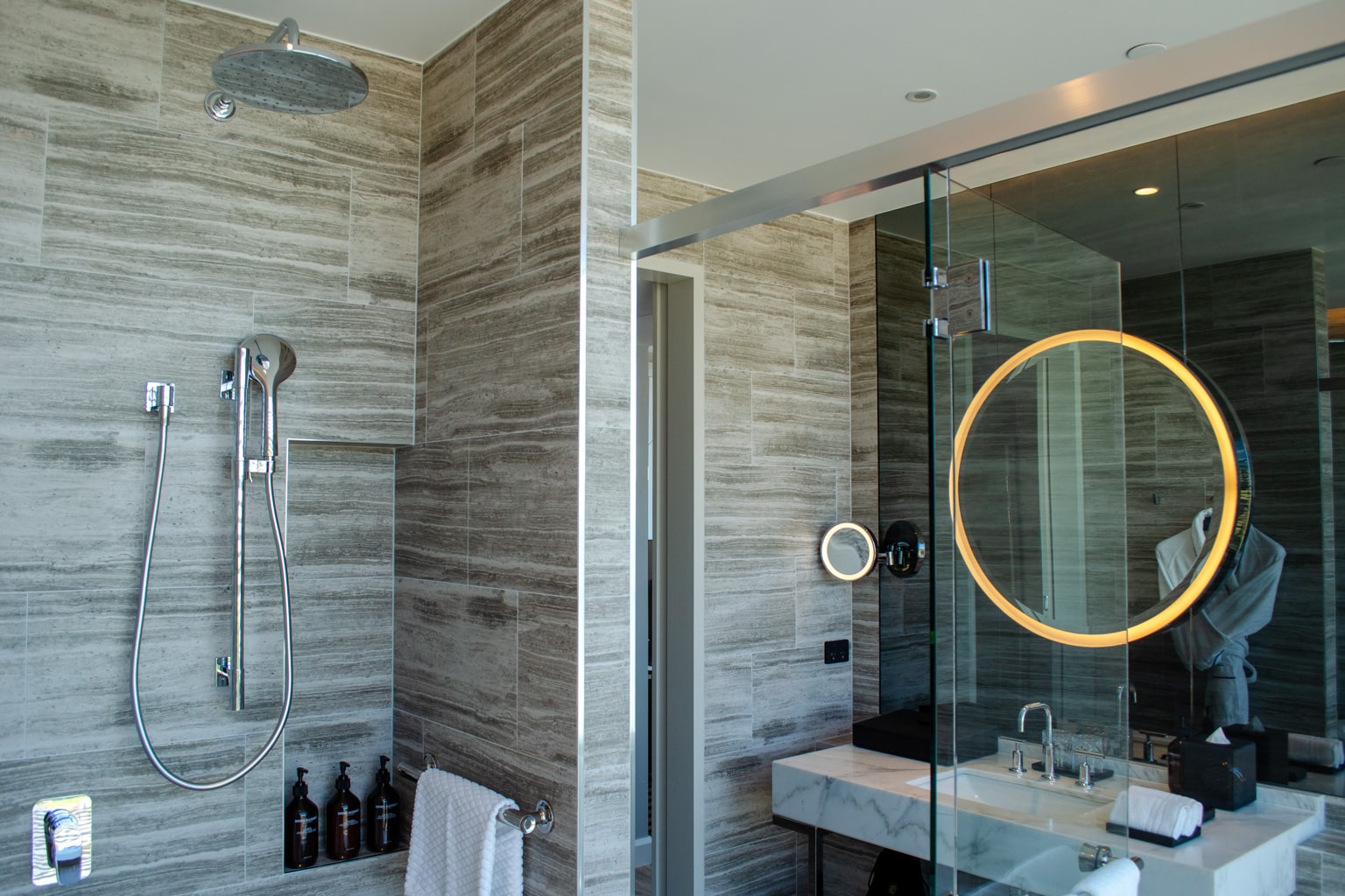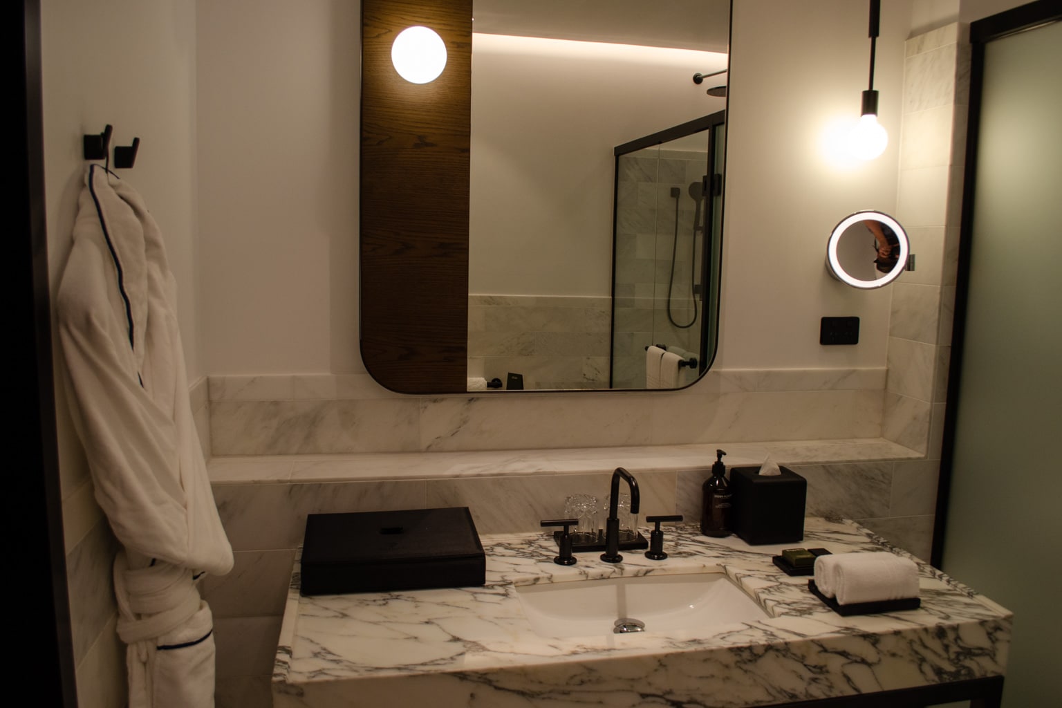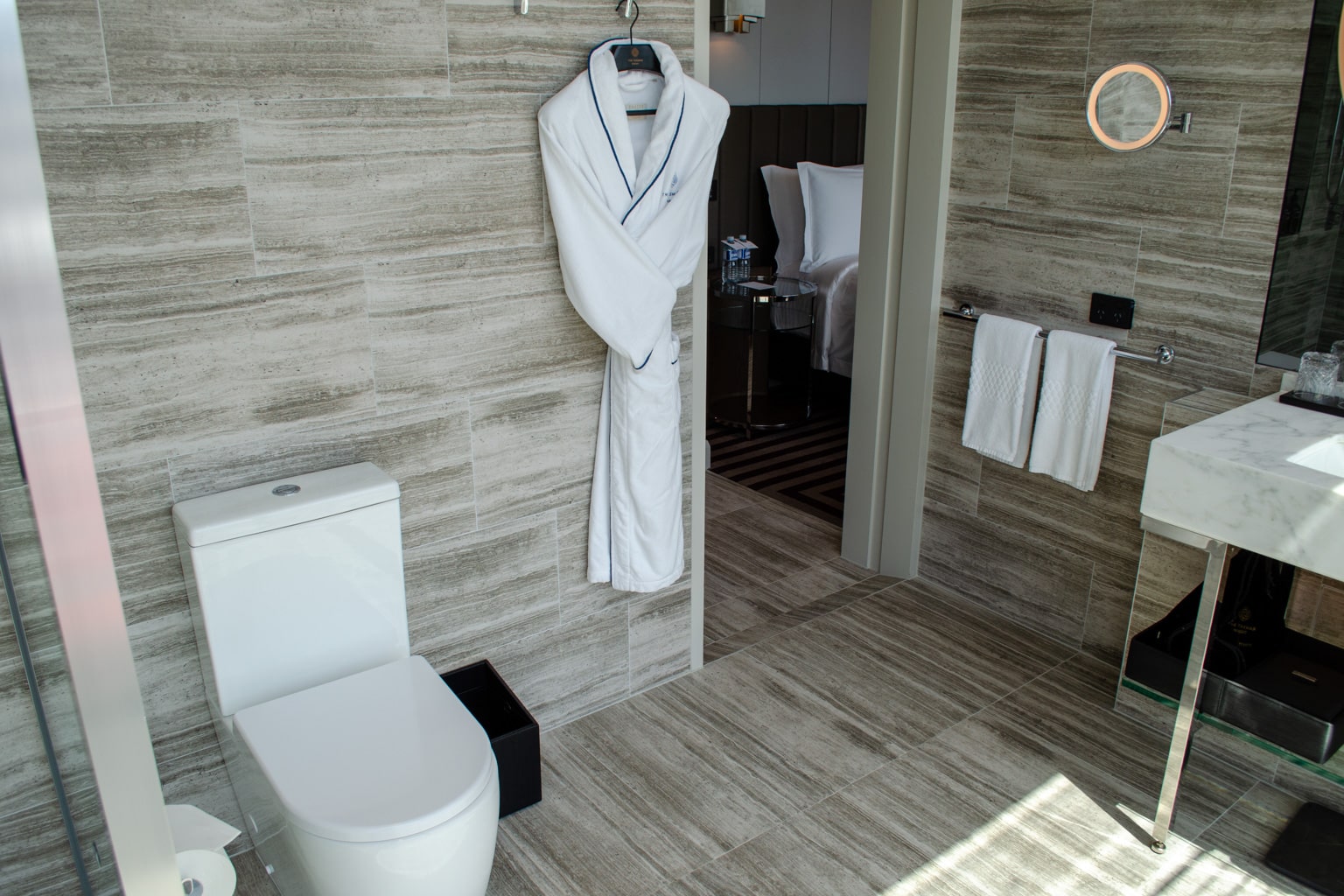A single marble vanity has a large LED-backlit mirror above, with amenities that include locally made soaps placed nearby. A plush bathrobe hangs on the wall close to the door.