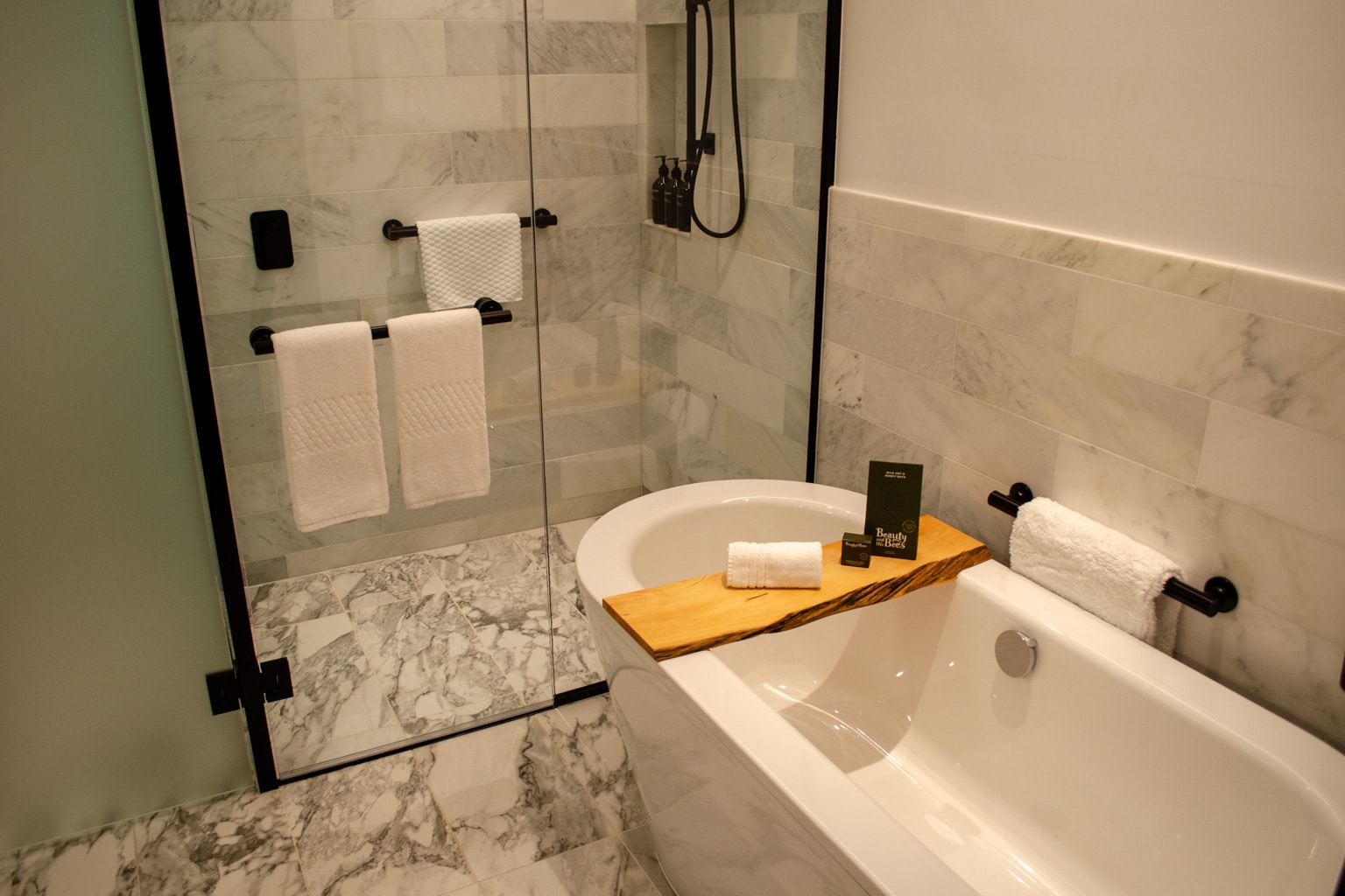 The bathtub and shower are housed in a single wet room. The bathtub has a plank of wood set out overtop, and made for a very comfortable and relaxing experience.