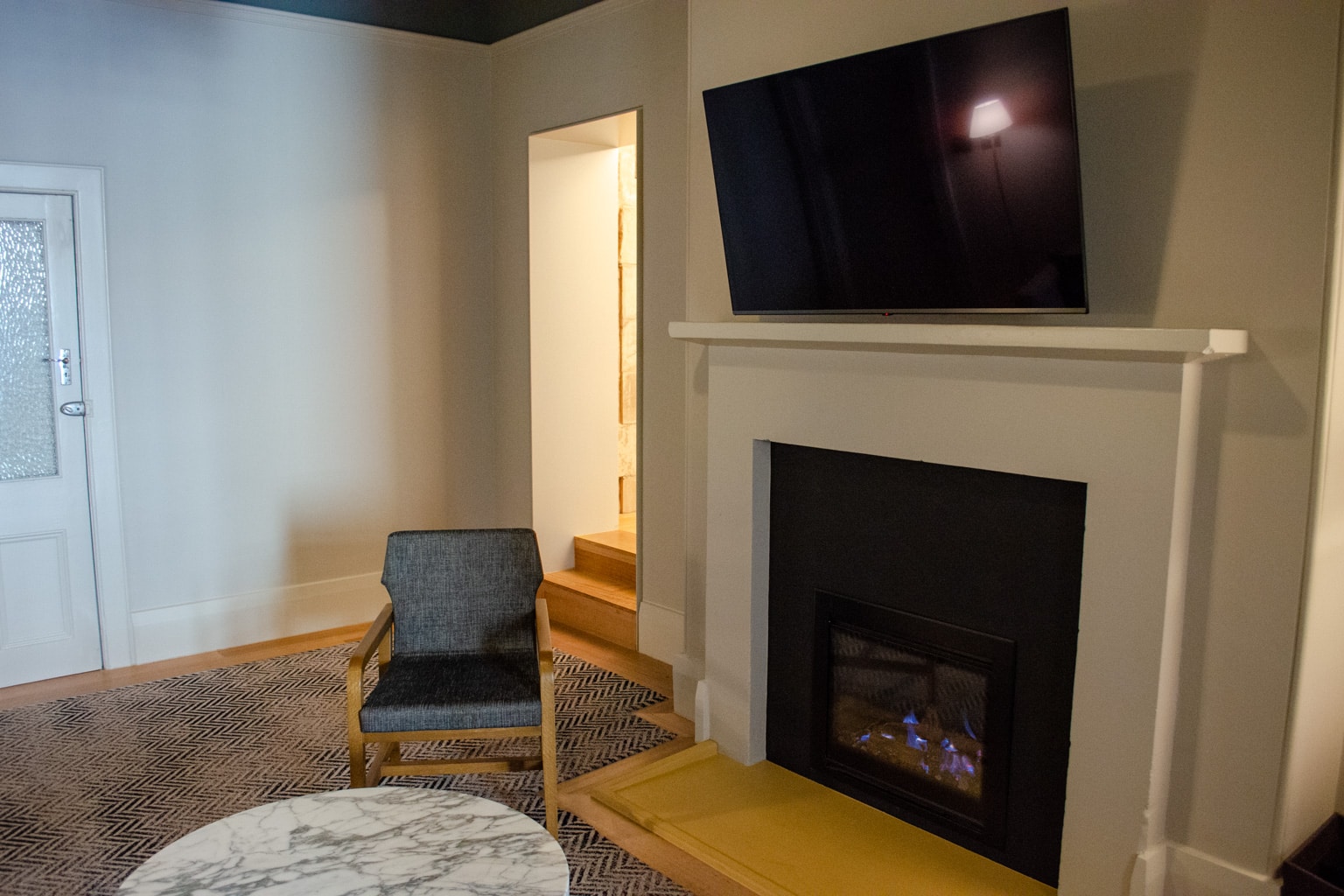 The furnishings in the living room were simple but comfortable, with a large grey couch, a charcoal-grey wooden armchair, and a marble coffee table. A flat-screen TV is mounted above the fireplace.