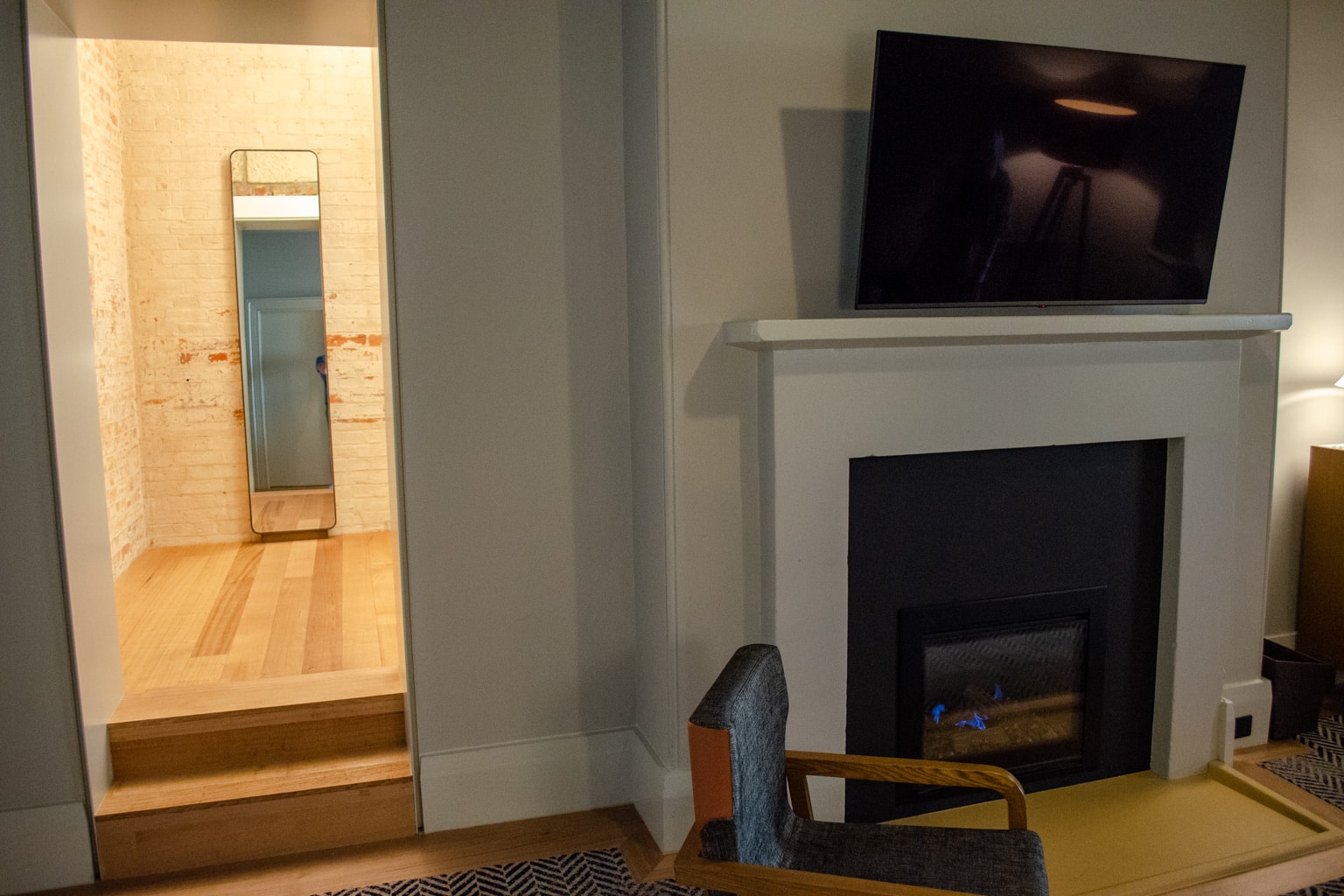 Upon entering the Heritage Suite, there is a foyer with another door to walk through. The second door opens up to the suite’s spacious living room, with a gas fireplace that was running as we arrived.