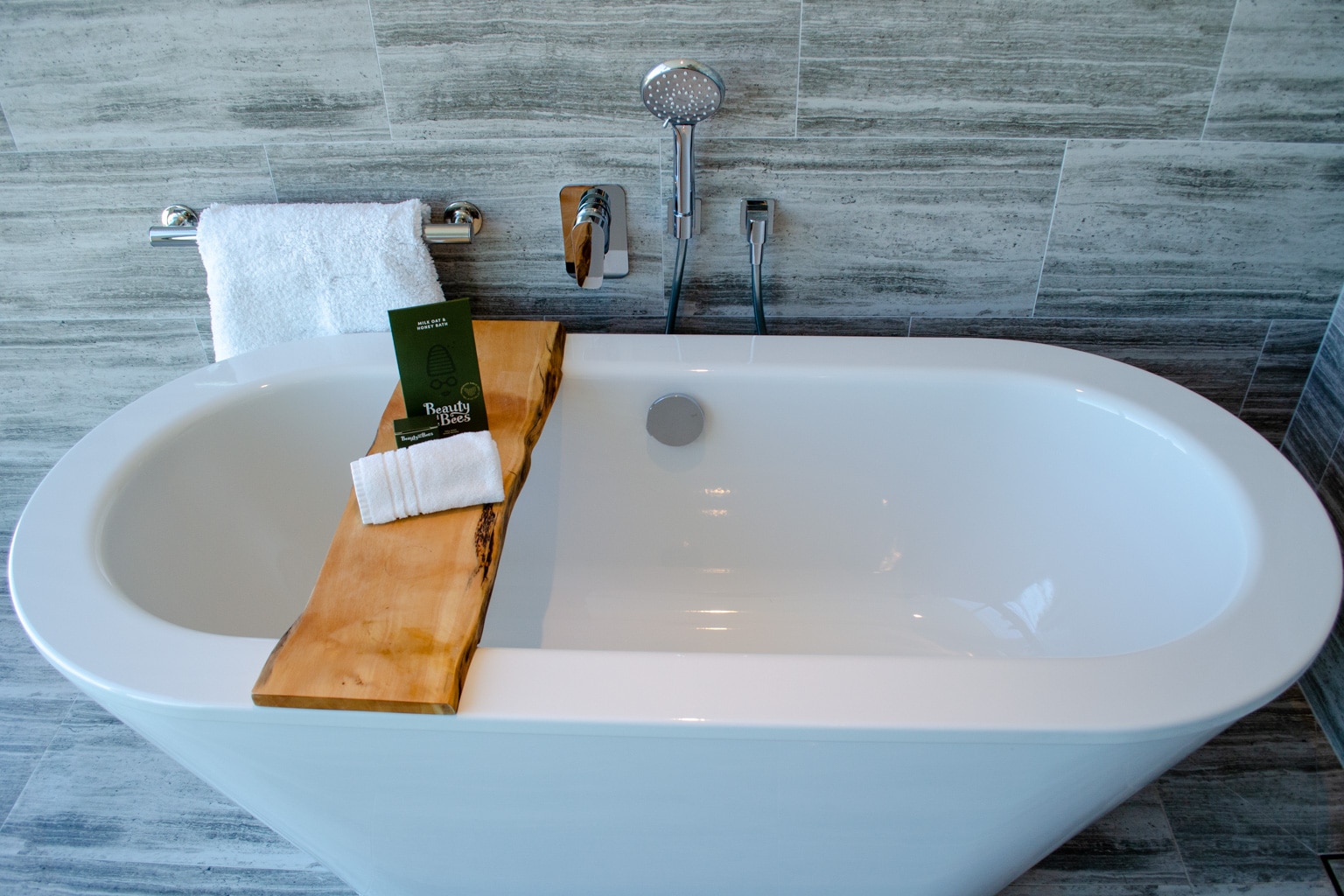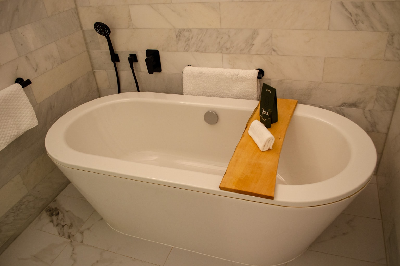 The bathtub isn’t housed in the shower room, as it was in our two other rooms. Rather, it’s tucked against the wall opposite from the vanity.