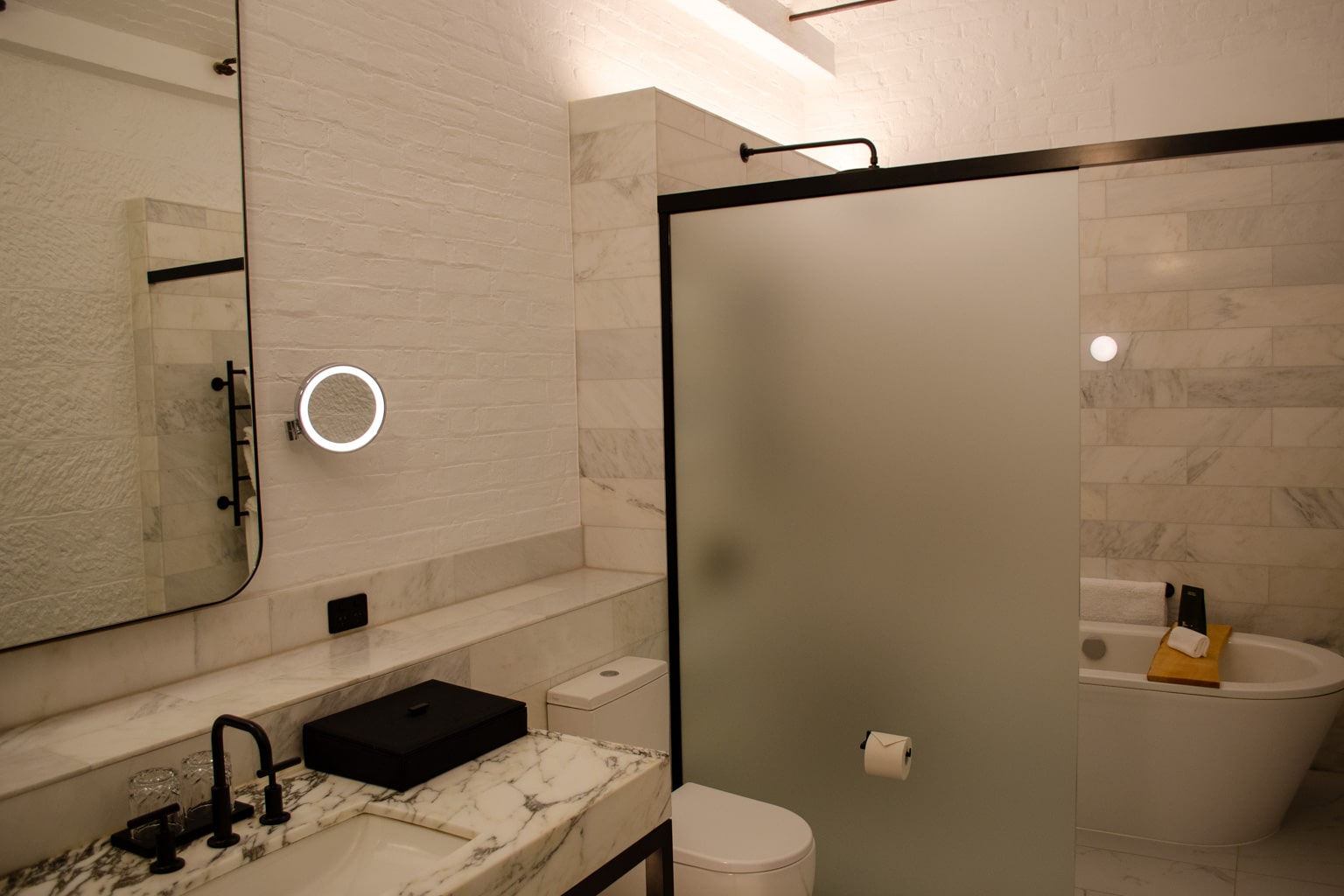The bathroom is very spacious and has high ceilings, with a single marble vanity under a rectangular mirror on a white-brick wall as you enter.