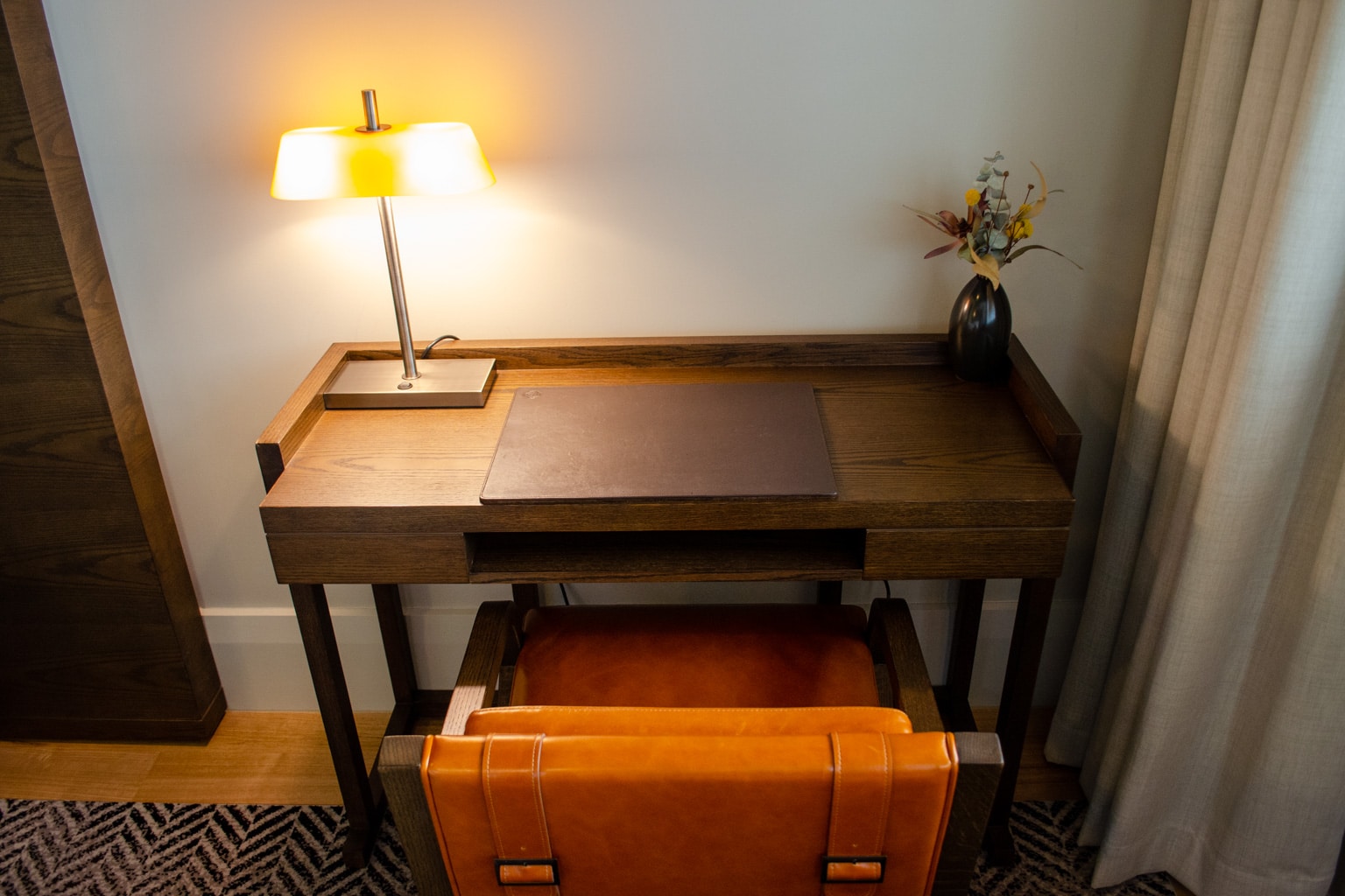 Tucked in the corner of the room is a wooden desk with plenty of character, as well as a slick leather chair.