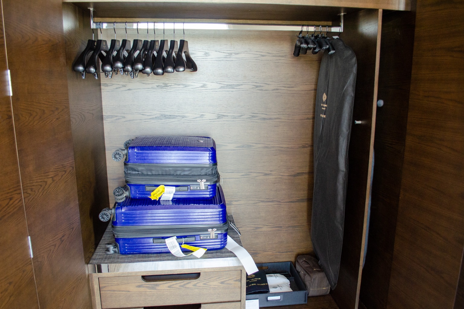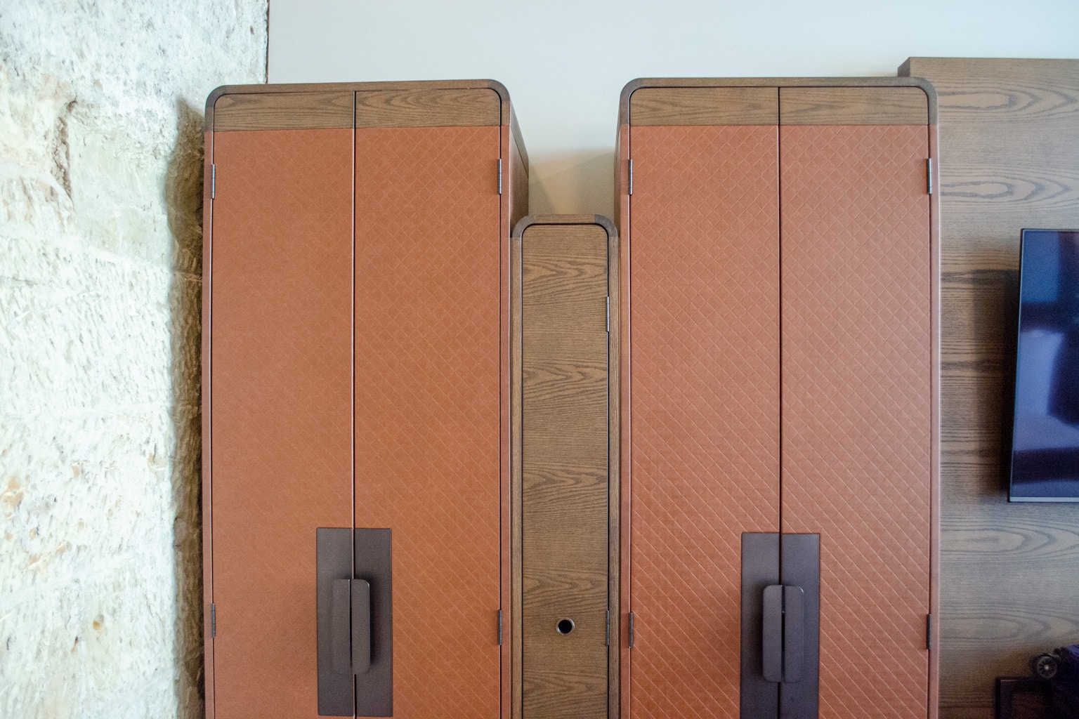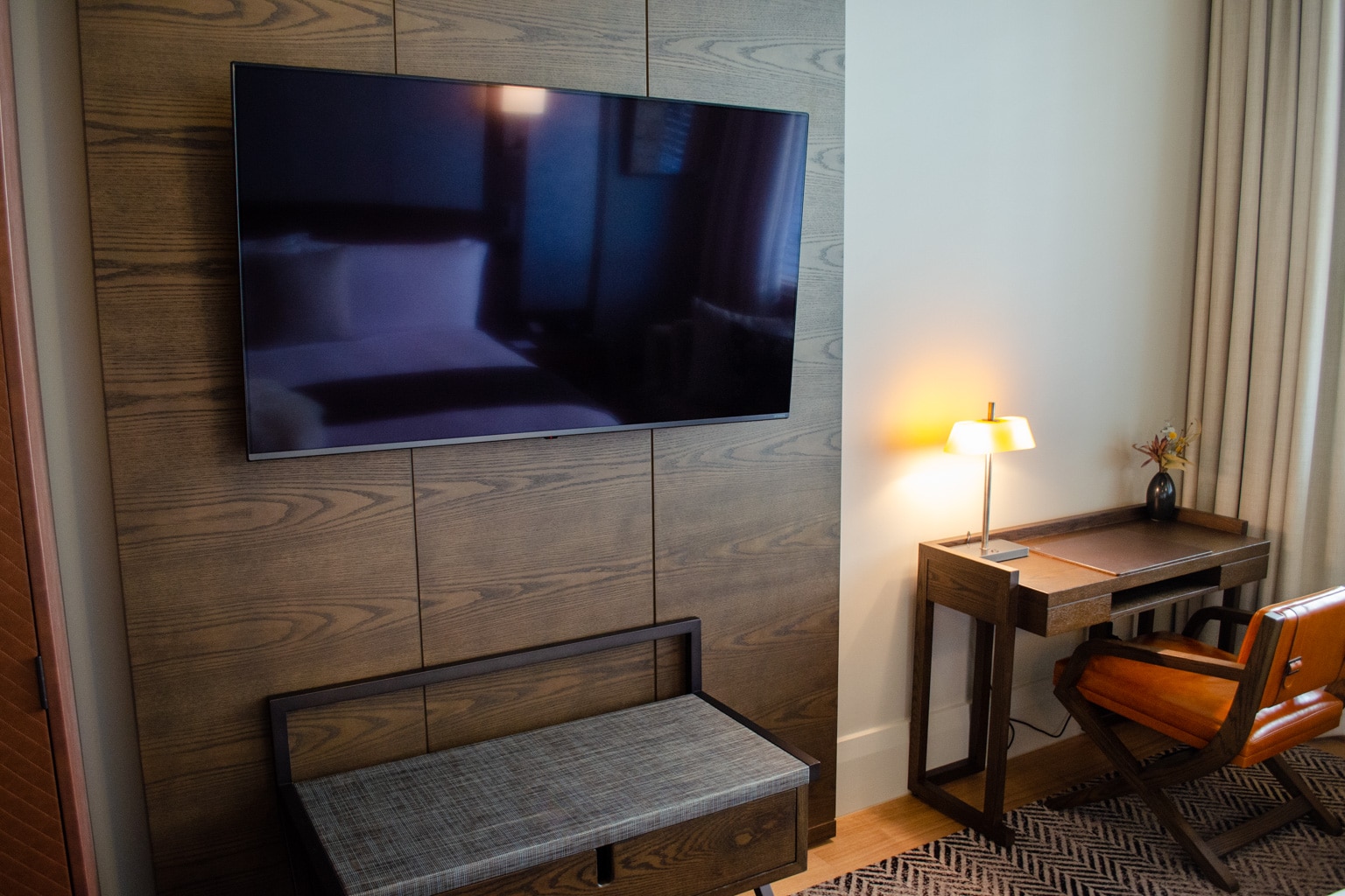 Next to the armoire is the room’s second flat-screen TV, which is mounted above a luggage rack.