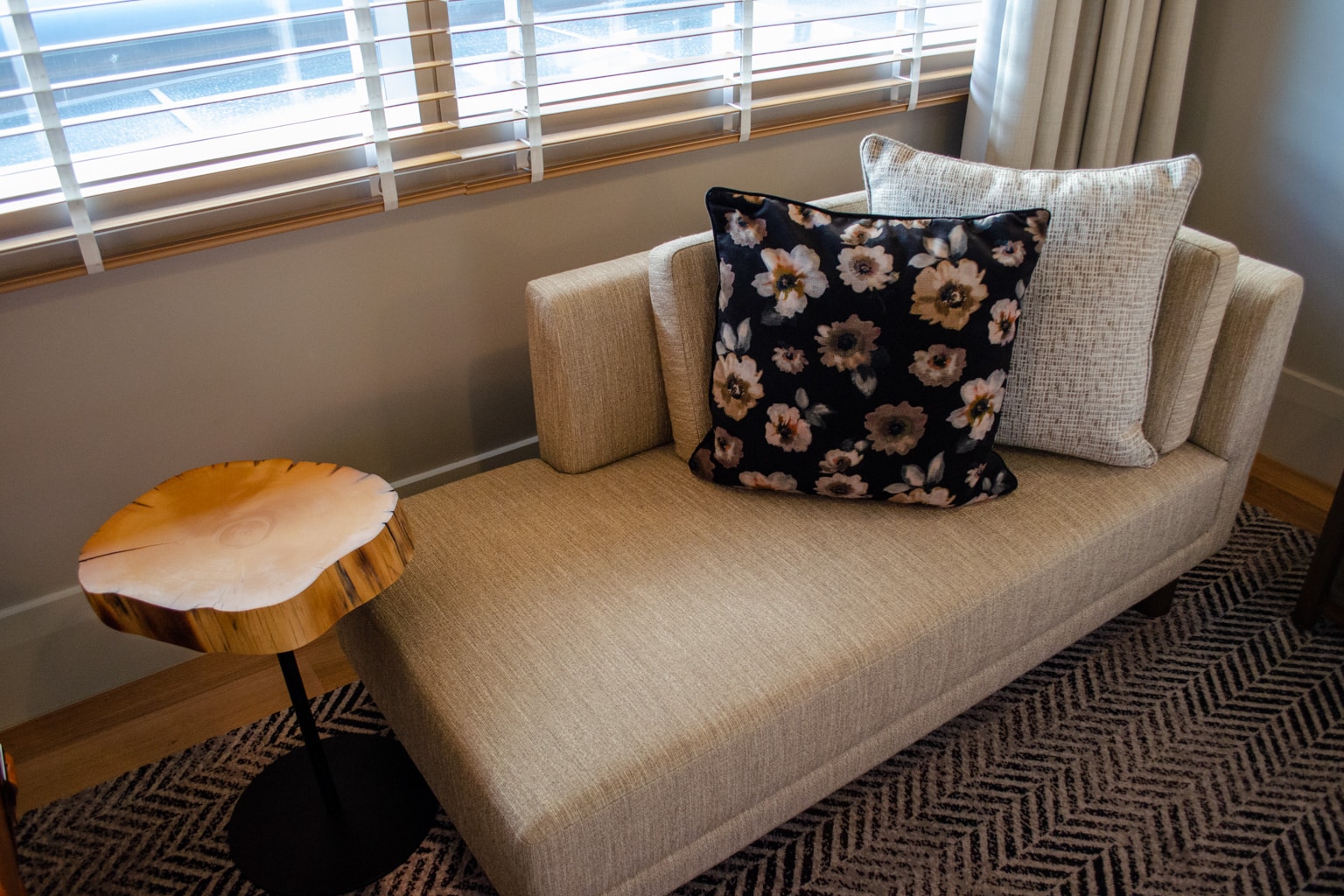 A grey chaise longue sits underneath the window, with a thick wooden coffee table at its foot.
