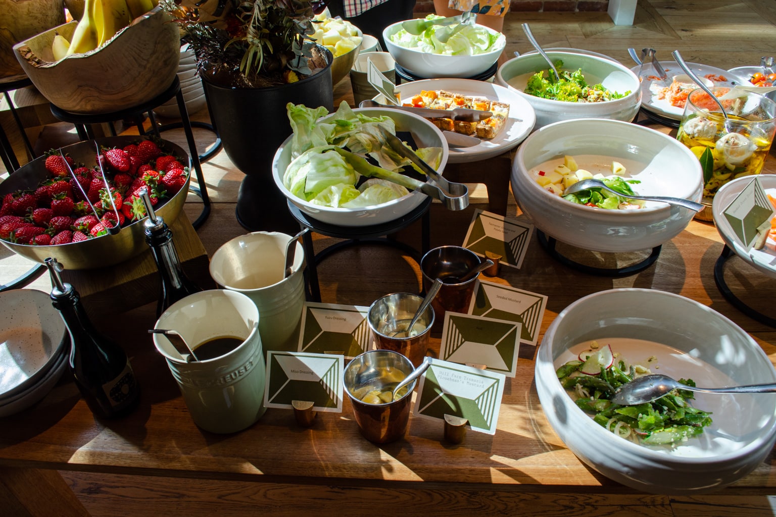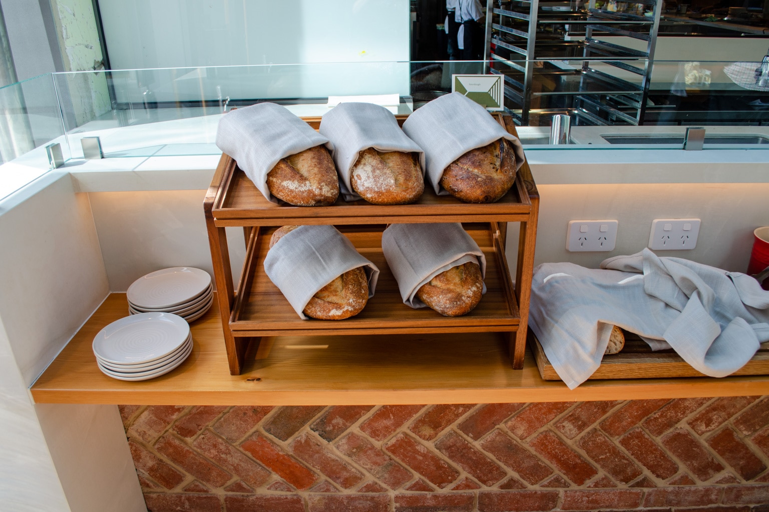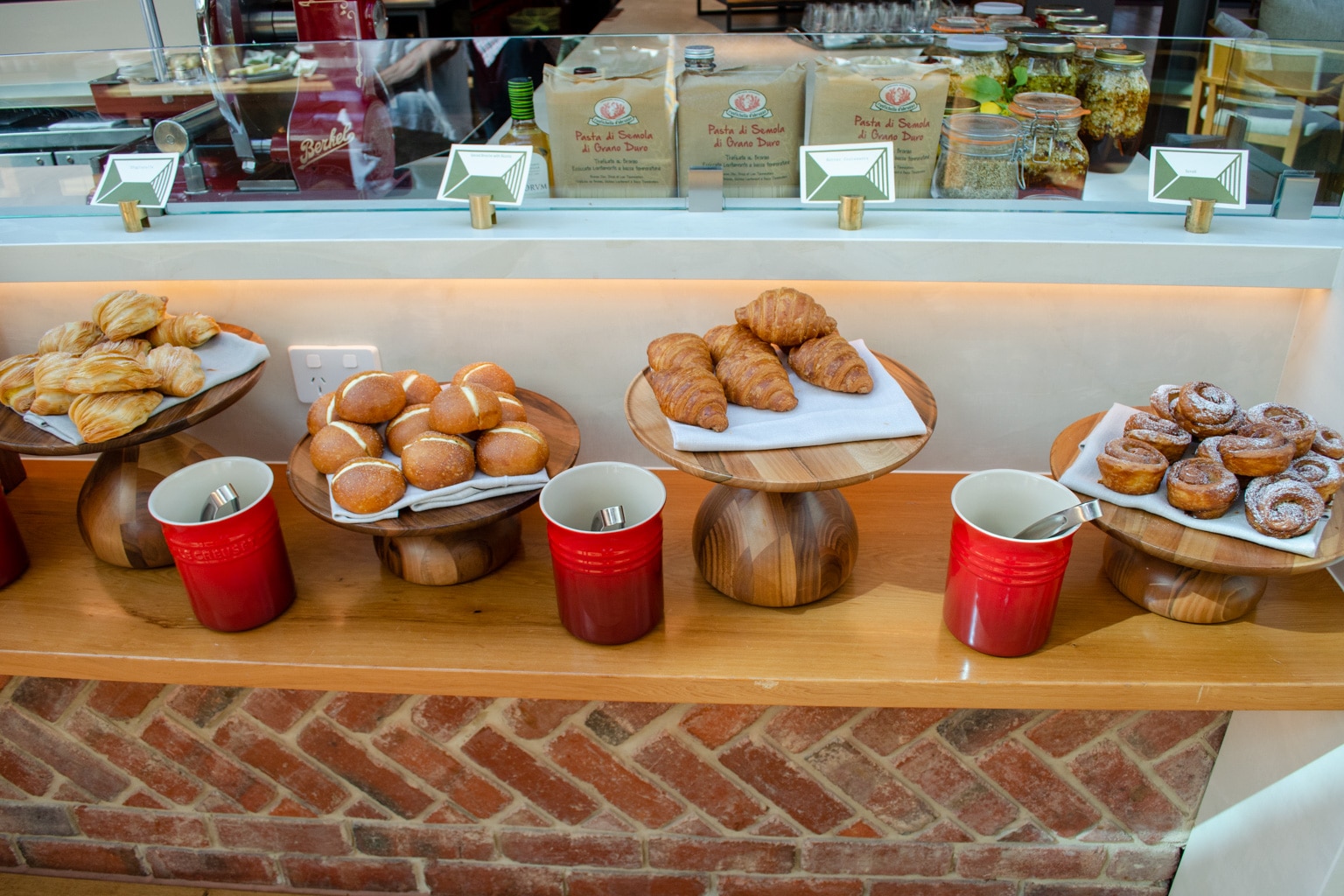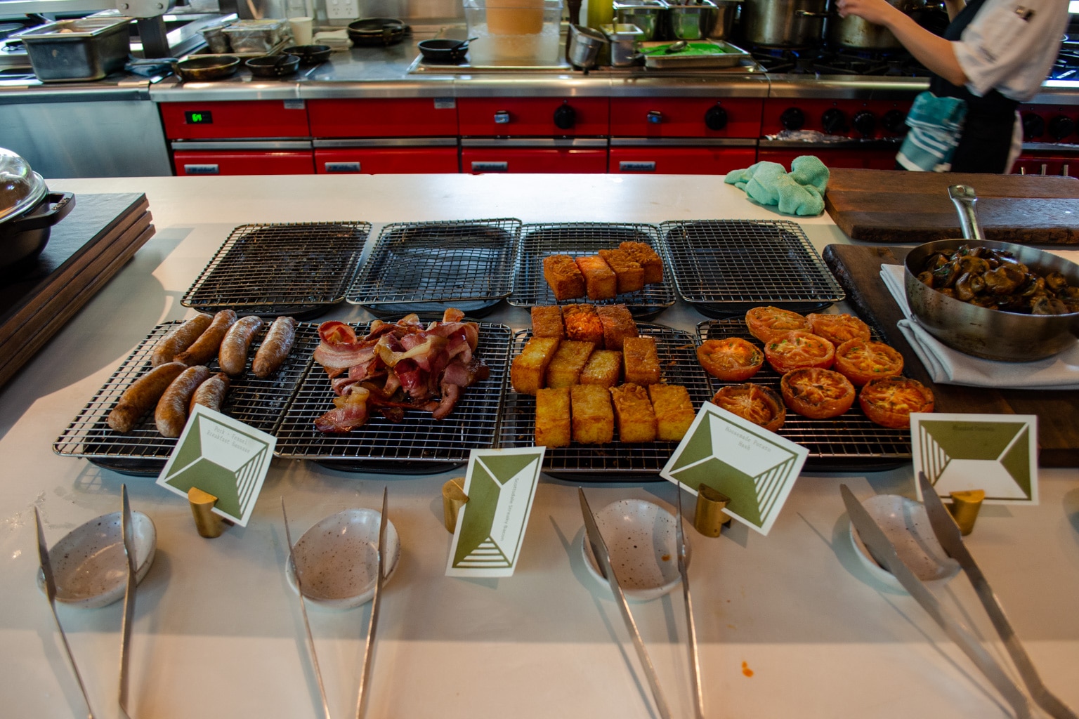 In the cold buffet, we found Tasmanian brie, Pyengana cheddar, Brookfarm muesli, West Haven yogurt, smoked ocean trout, and Tasmanian leatherwood honey, to name a few. Furthermore, there were beautiful pastries, baked goods, preserved vegetables, a salad bar, and fresh fruits.
