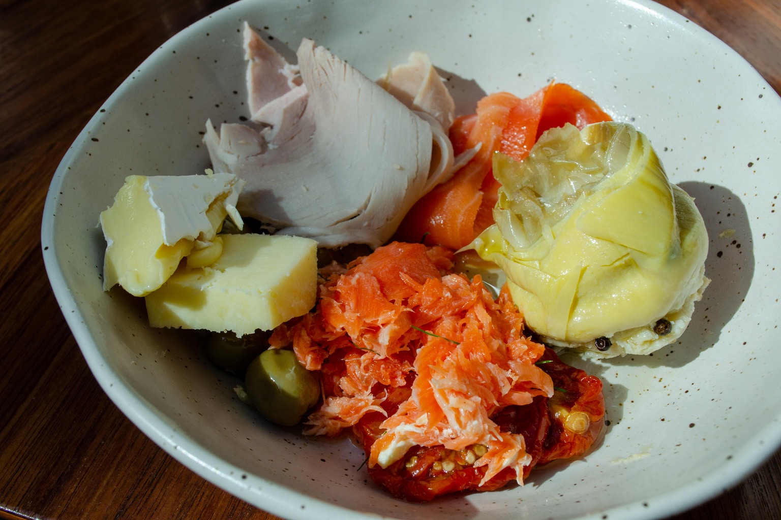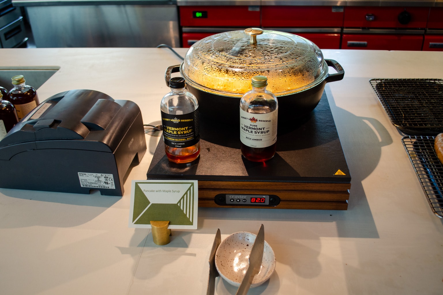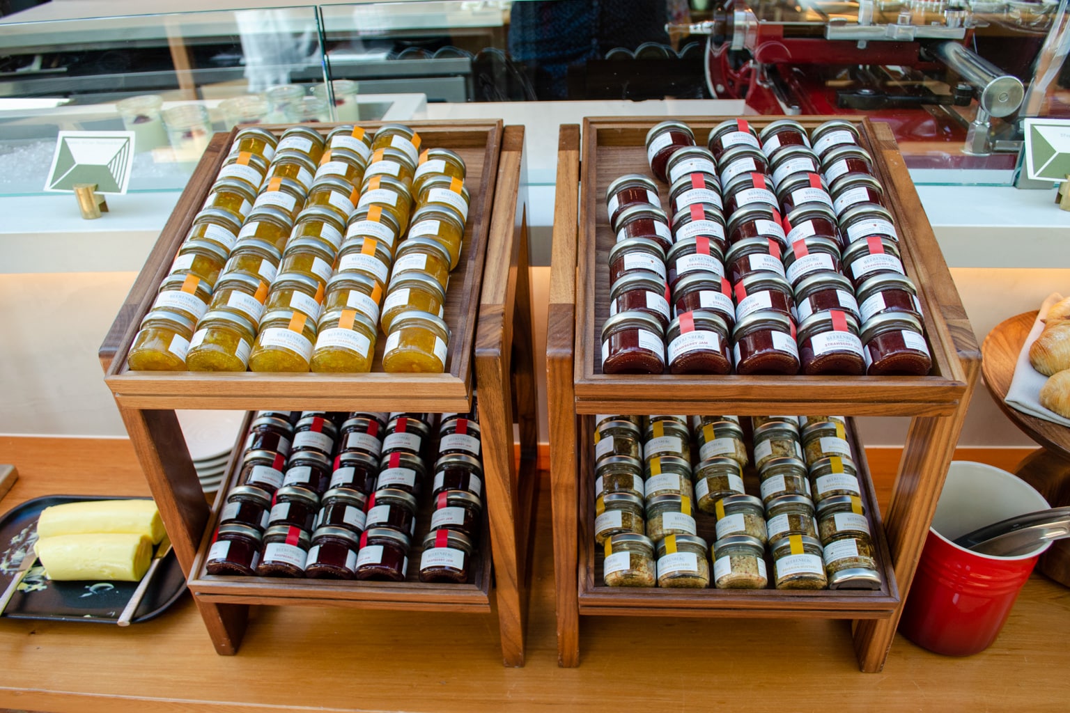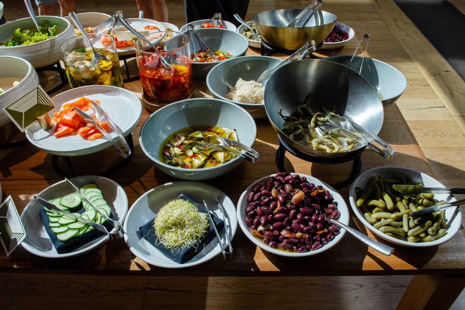 In the cold buffet, we found Tasmanian brie, Pyengana cheddar, Brookfarm muesli, West Haven yogurt, smoked ocean trout, and Tasmanian leatherwood honey, to name a few. Furthermore, there were beautiful pastries, baked goods, preserved vegetables, a salad bar, and fresh fruits.