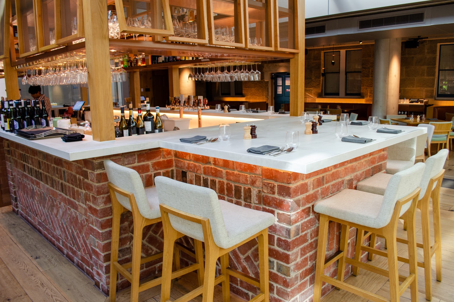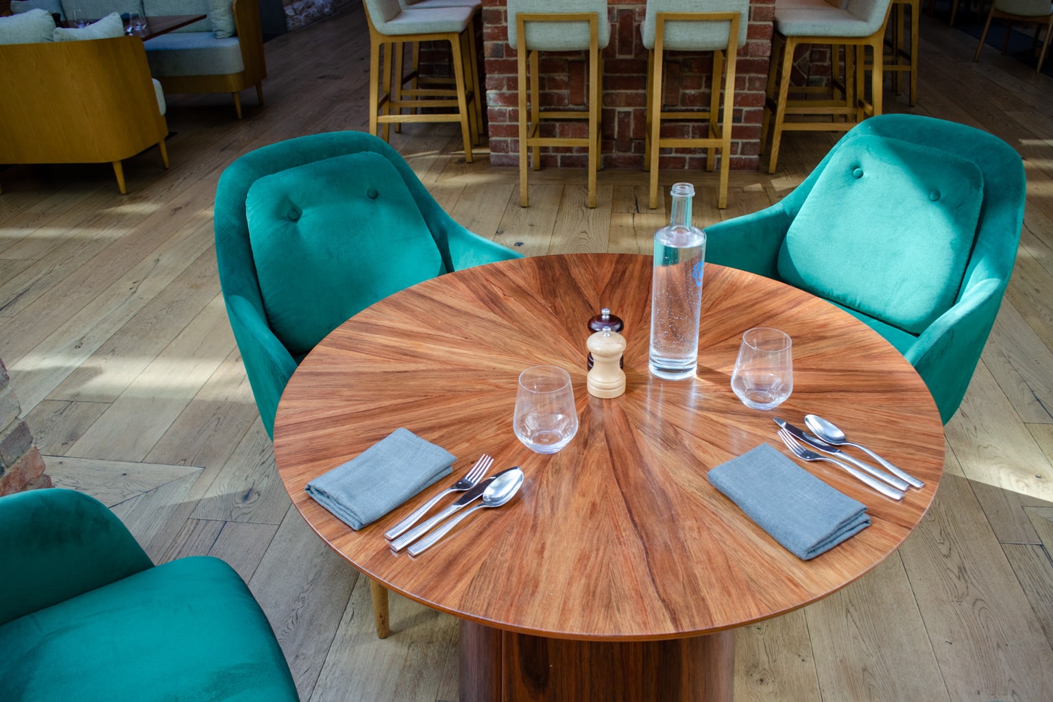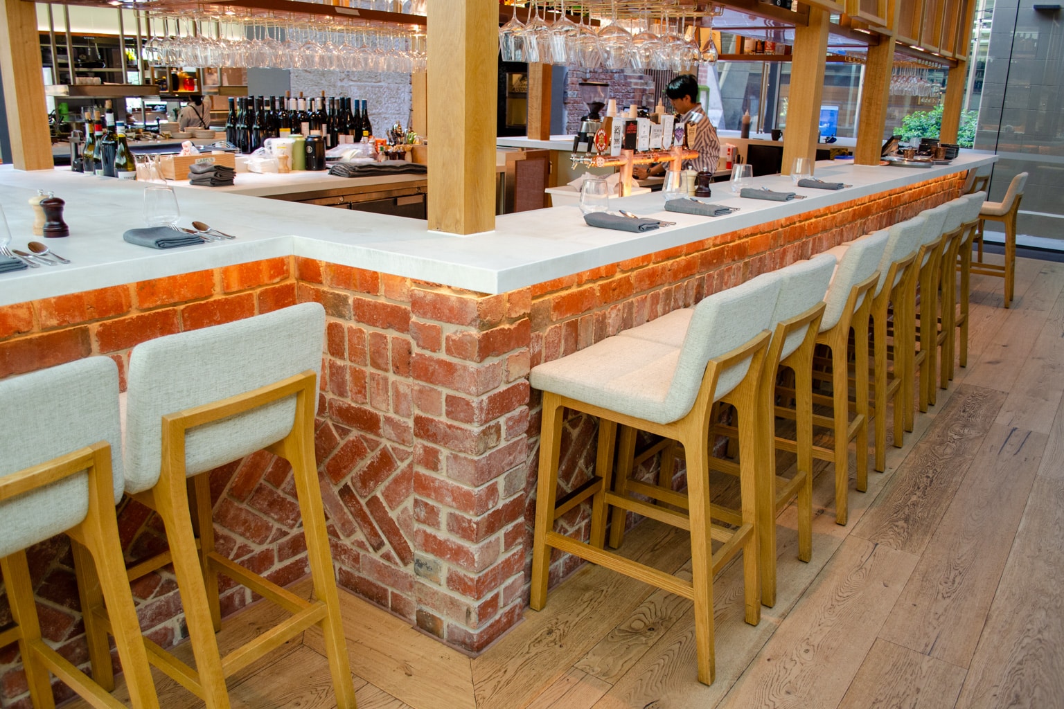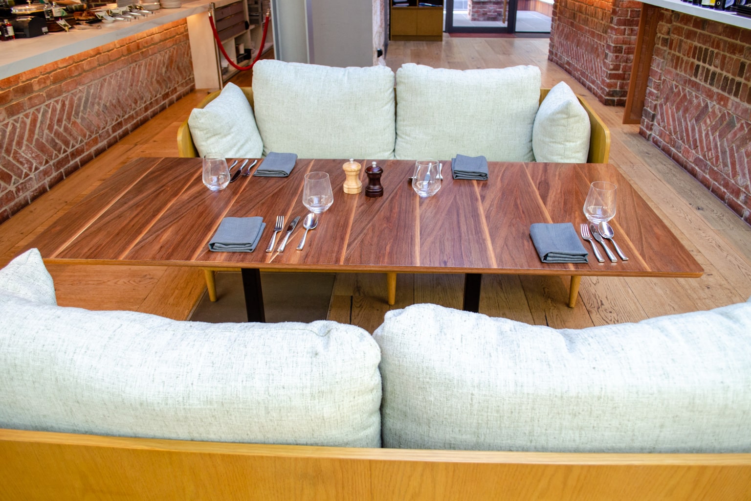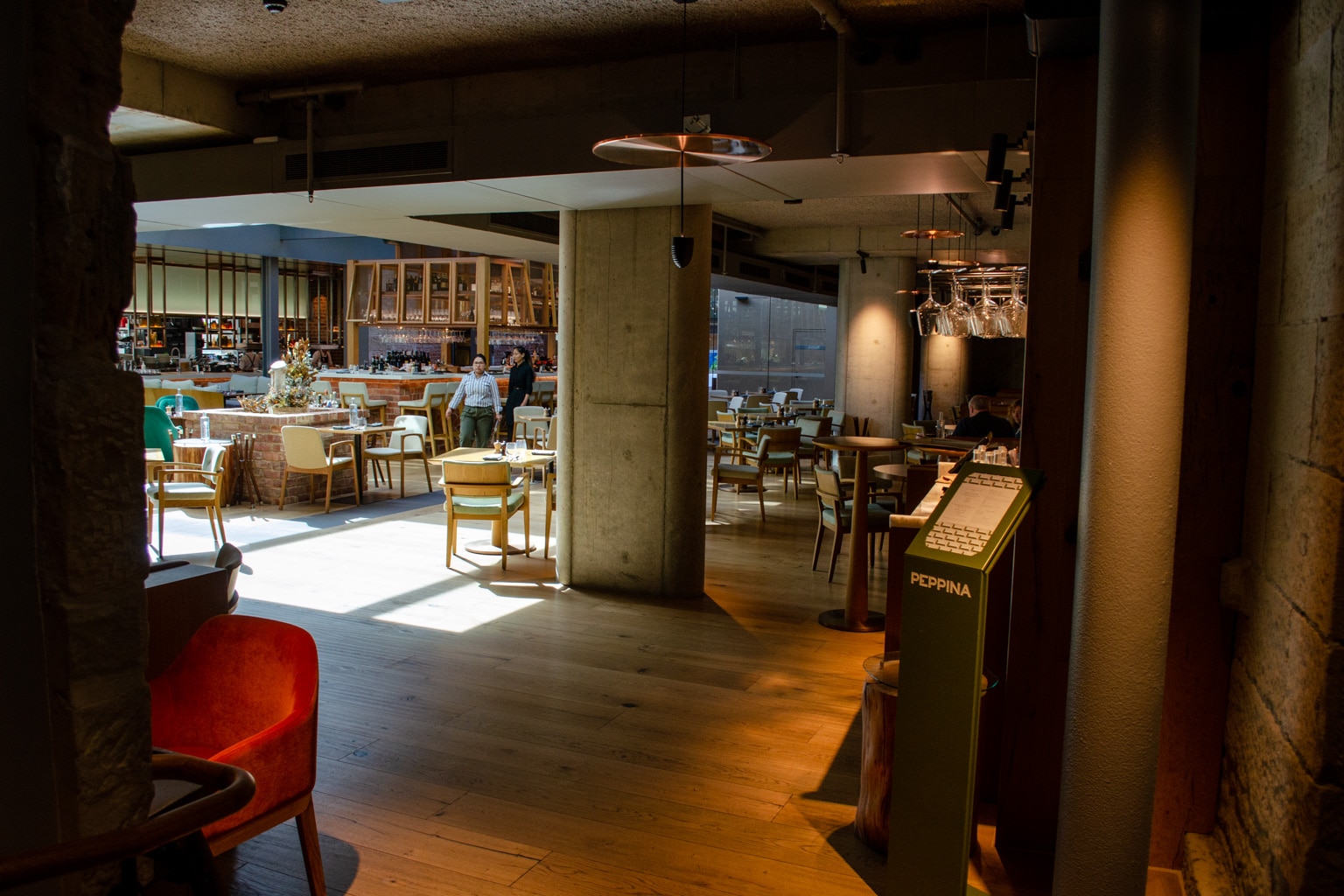 Peppina is a lovely space, characterized by brick, wood, and comfortable seats.