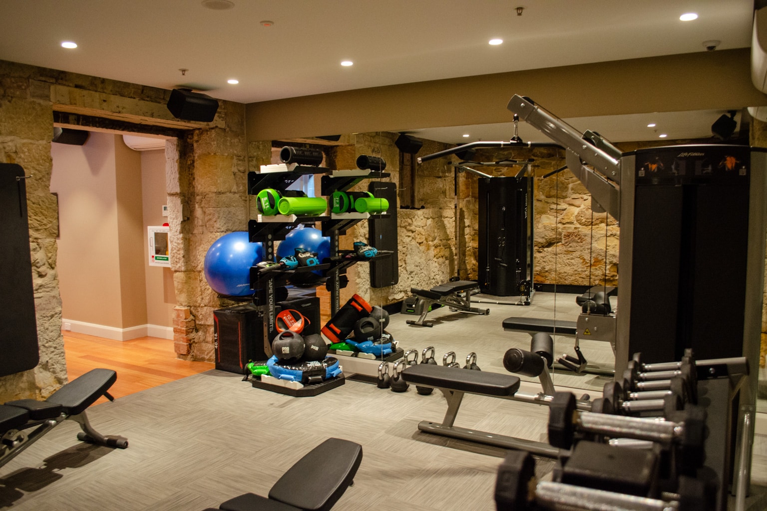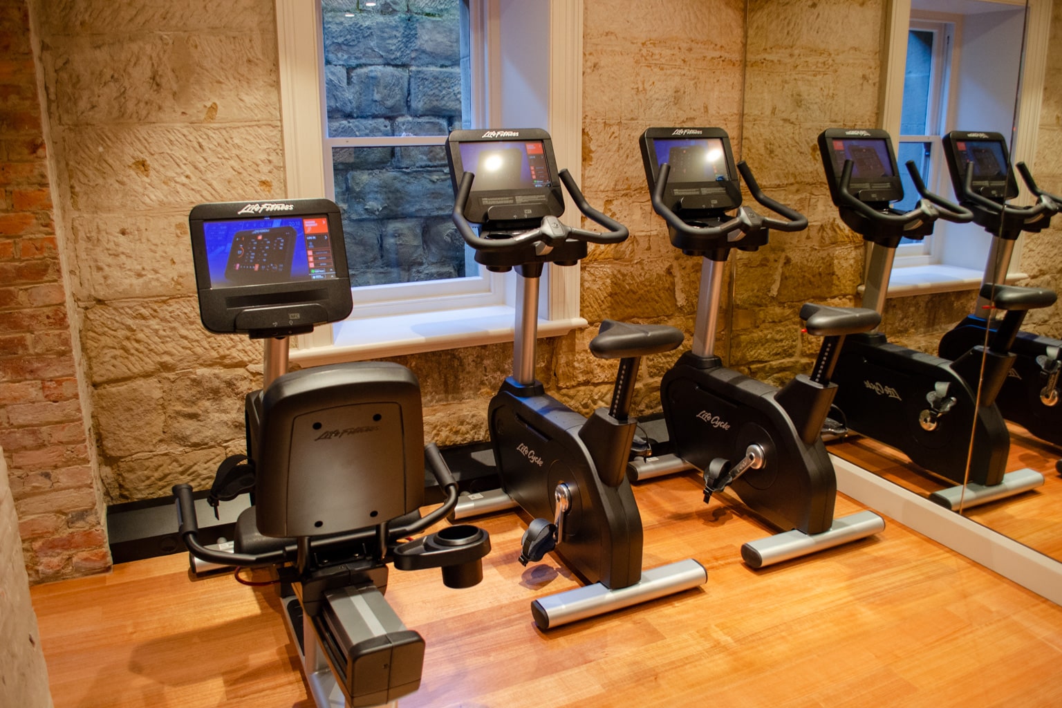Once inside, you’ll find beautifully preserved stone walls and a range of exercise equipment, including treadmills, exercise bikes, and a room filled with strength-training equipment.