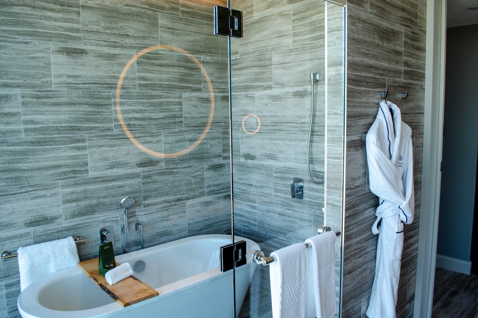 Upon entering the Panoramic King Room, there’s a small foyer that’s home to a large armoire and the entrance to the bathroom. Our luggage had been delivered to the room and stacked neatly inside, which was a nice touch, and we also found a second plush bathrobe and cozy slippers inside.