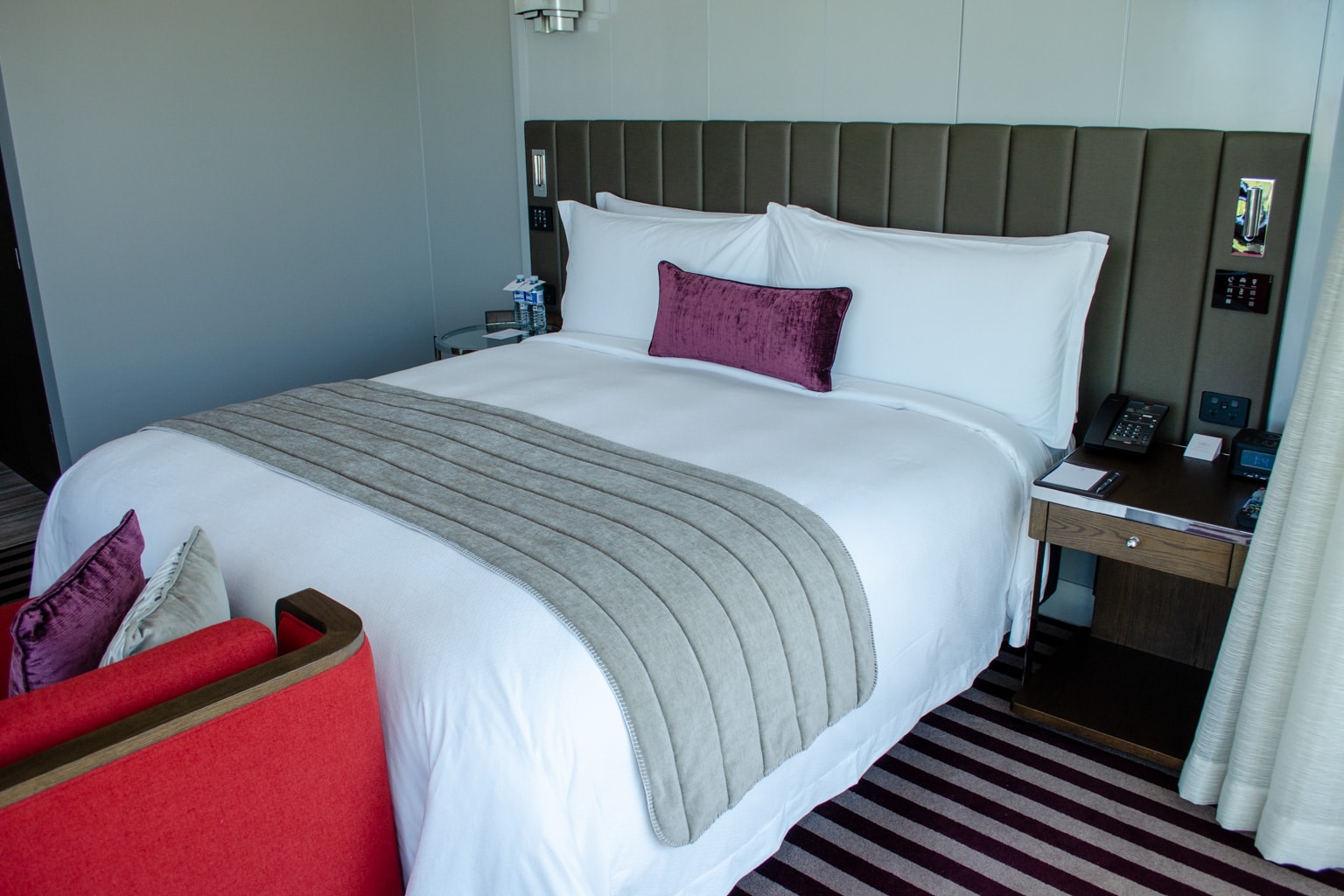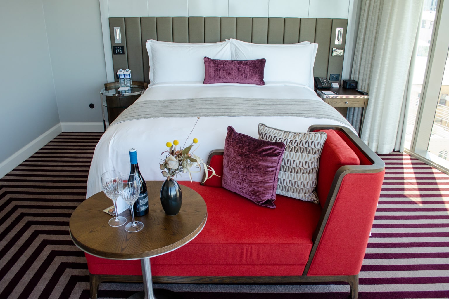 The king bed is the room’s centrepiece, with a bright red chaise longue at its foot.