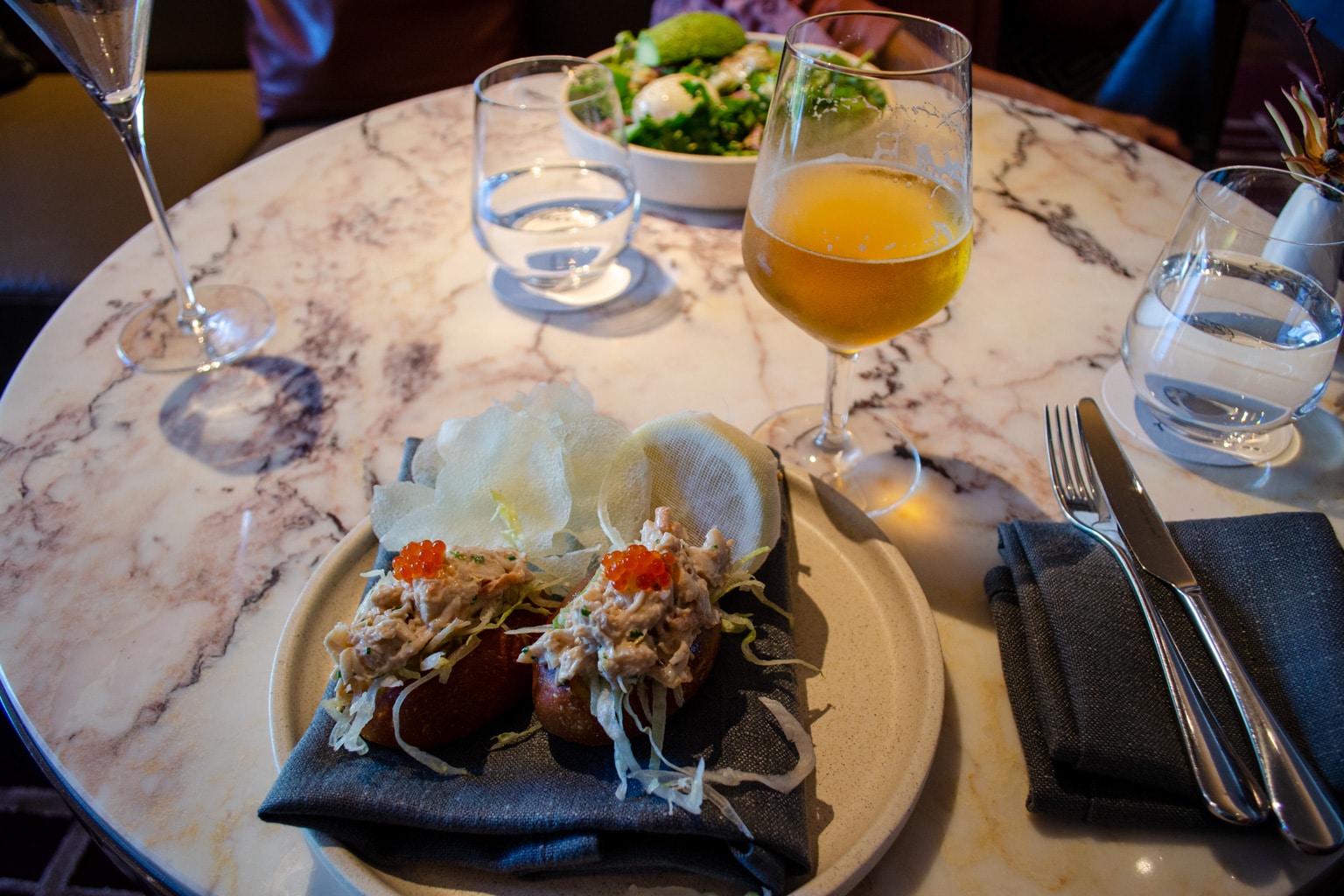 We sat down for a bite to eat upon our arrival at the hotel, as well as a lovely coffee to start each day. For a light lunch, I ordered the lobster rolls and my wife Ashley ordered a broccolini salad.