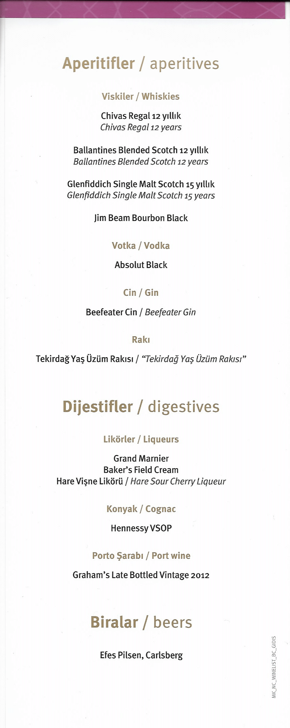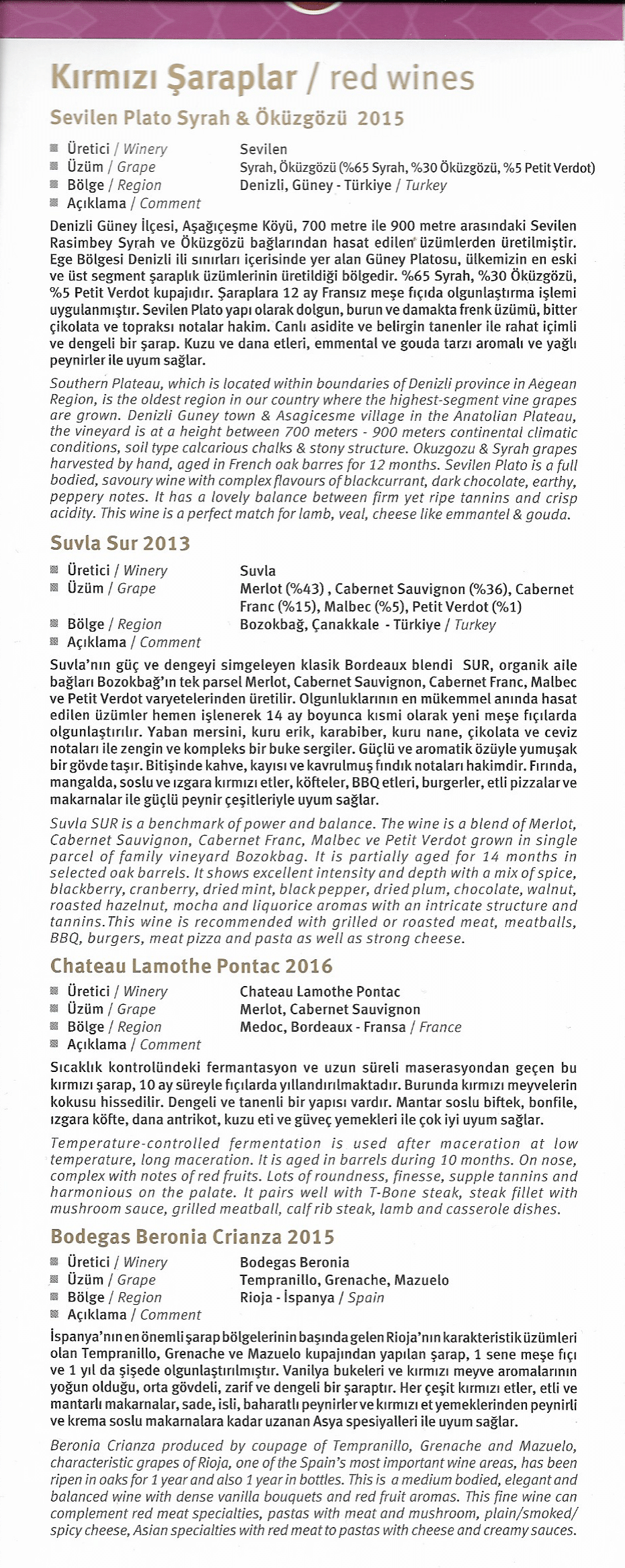 Meanwhile, the wine list and beverage menu read as follows: