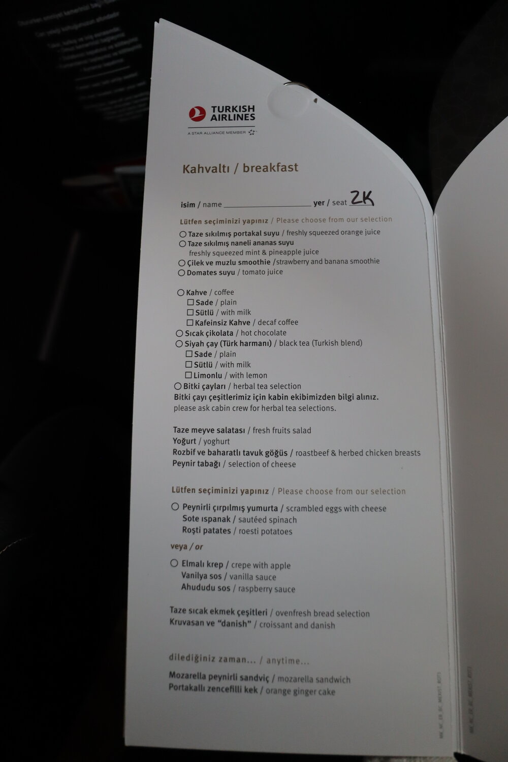 Every Turkish Airlines flight has an onboard chef who oversees the catering for the flight and often interacts with passengers as well. On this flight, our head chef was a particularly friendly fellow, who came across as very warm and genuine as he first told me to take my time choosing my breakfast order, before later returning to my seat to take my breakfast card, verifying each item that I had checked off one-by-one.