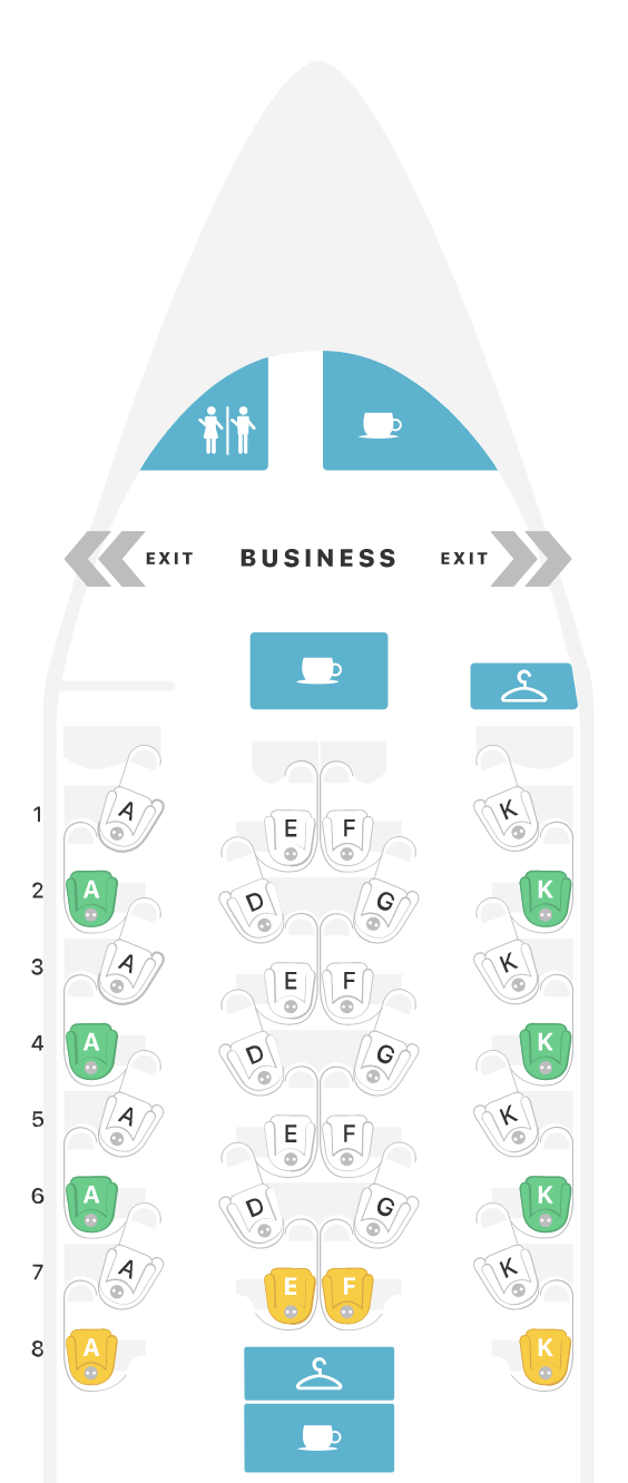 The 30 business class seats are arranged across eight rows in a single cabin in a 1-2-1 configuration, with the middle seats ending at Row 7 and the window seats continuing to Row 8. The seats are staggered from row to row, meaning that the middle seats alternate between being closer together and being farther apart, while the window seats alternate between being closer to the window and closer to the aisle.