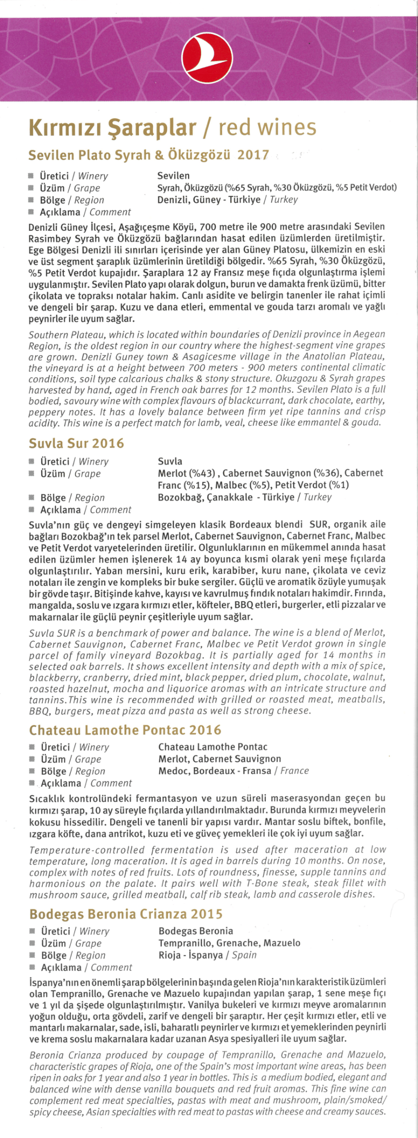 Turkish Airlines A330 business class – Menus