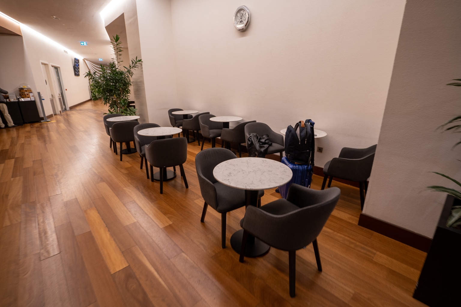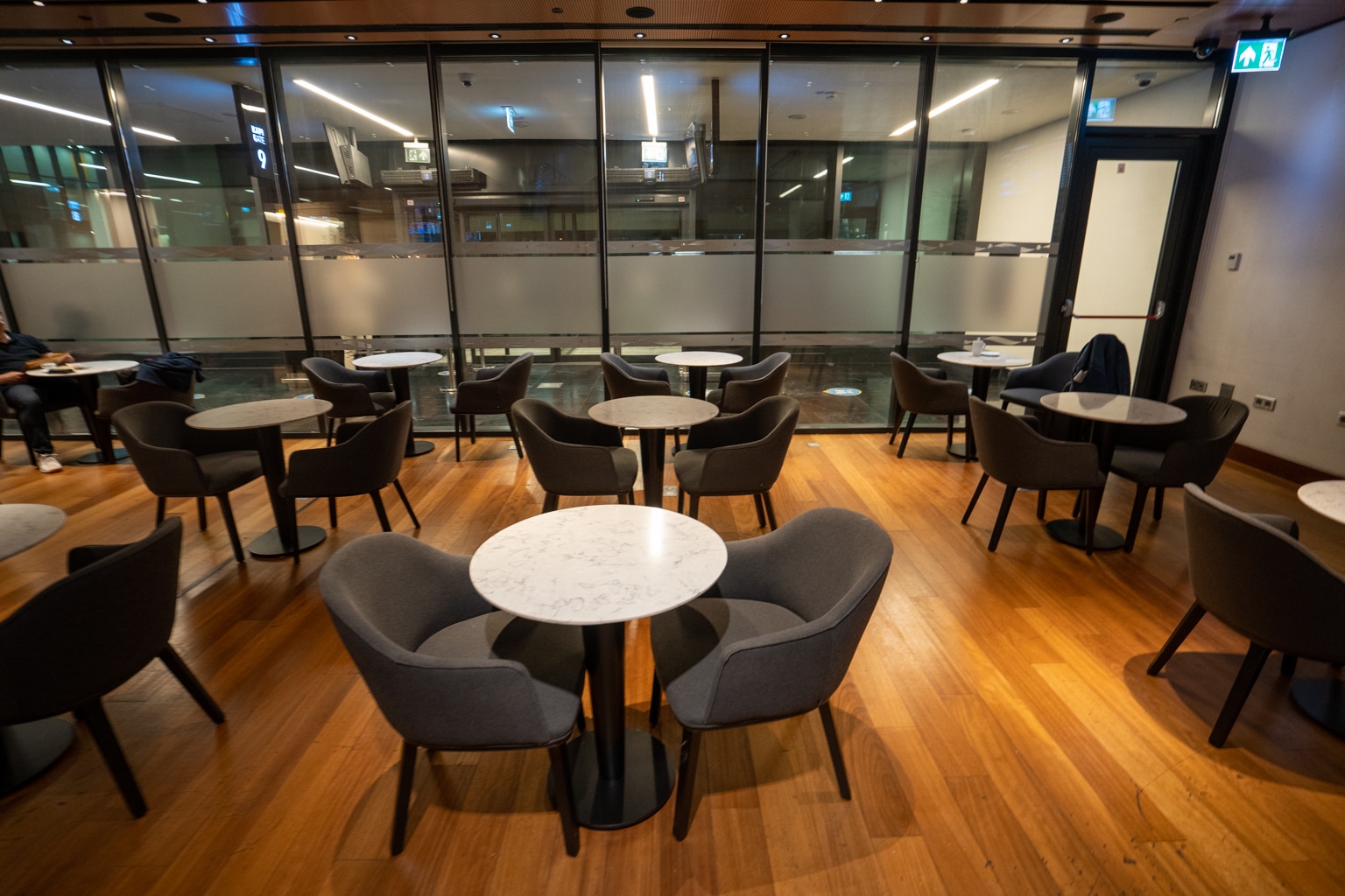 As you first enter the lounge, you’ll find that the space primarily consists of two-person dining tables. You’ll also find these seats scattered throughout the lounge in various clusters and along the walls.