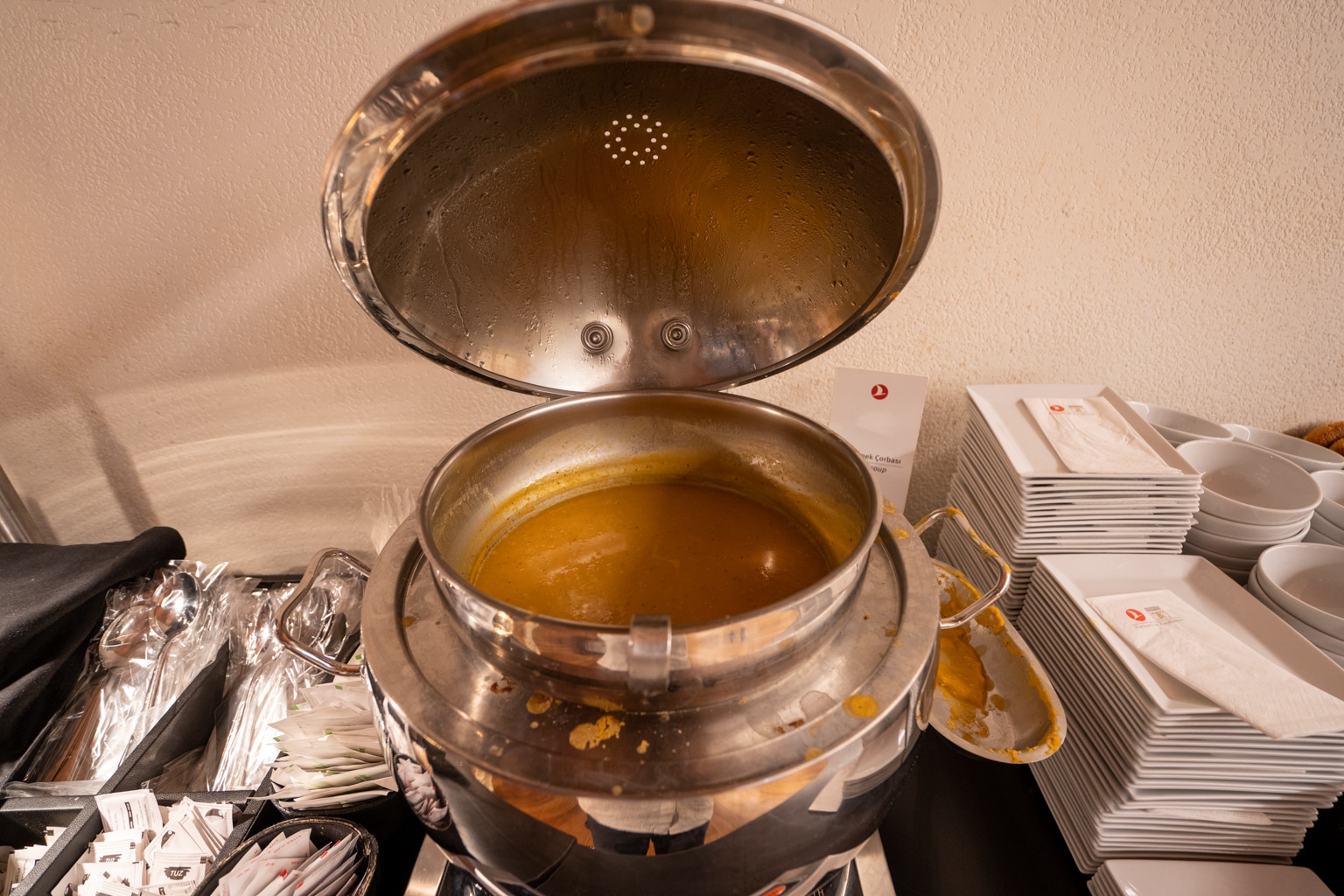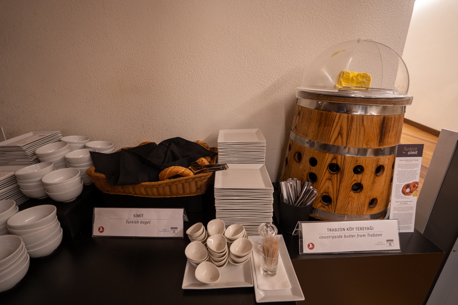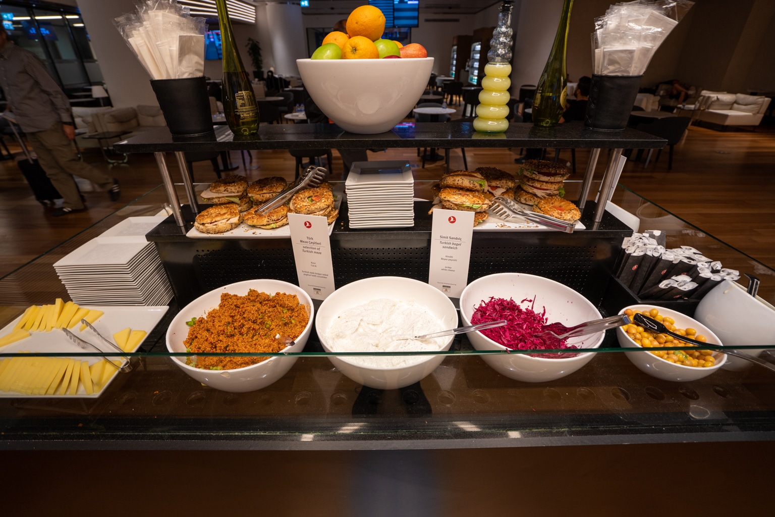 In a separate section, the lounge has a mishmash of Turkish meze, bagel sandwiches, and some fresh fruit.