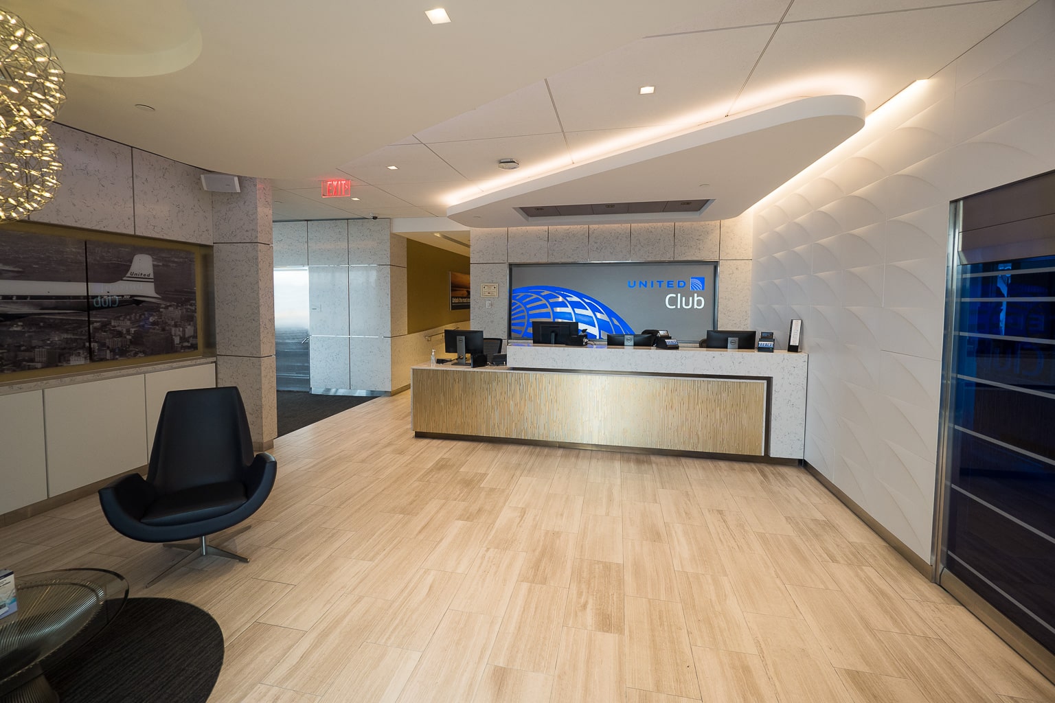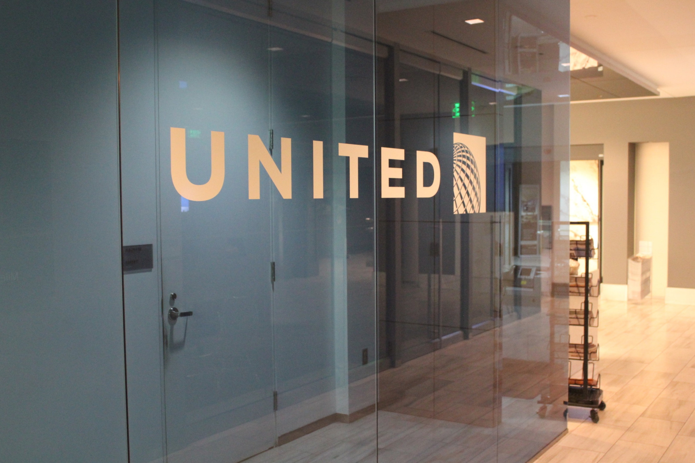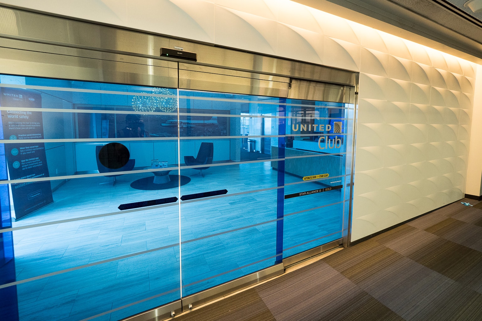 The lounge is framed by automatic sliding glass doors, tinted United’s signature blue tone.